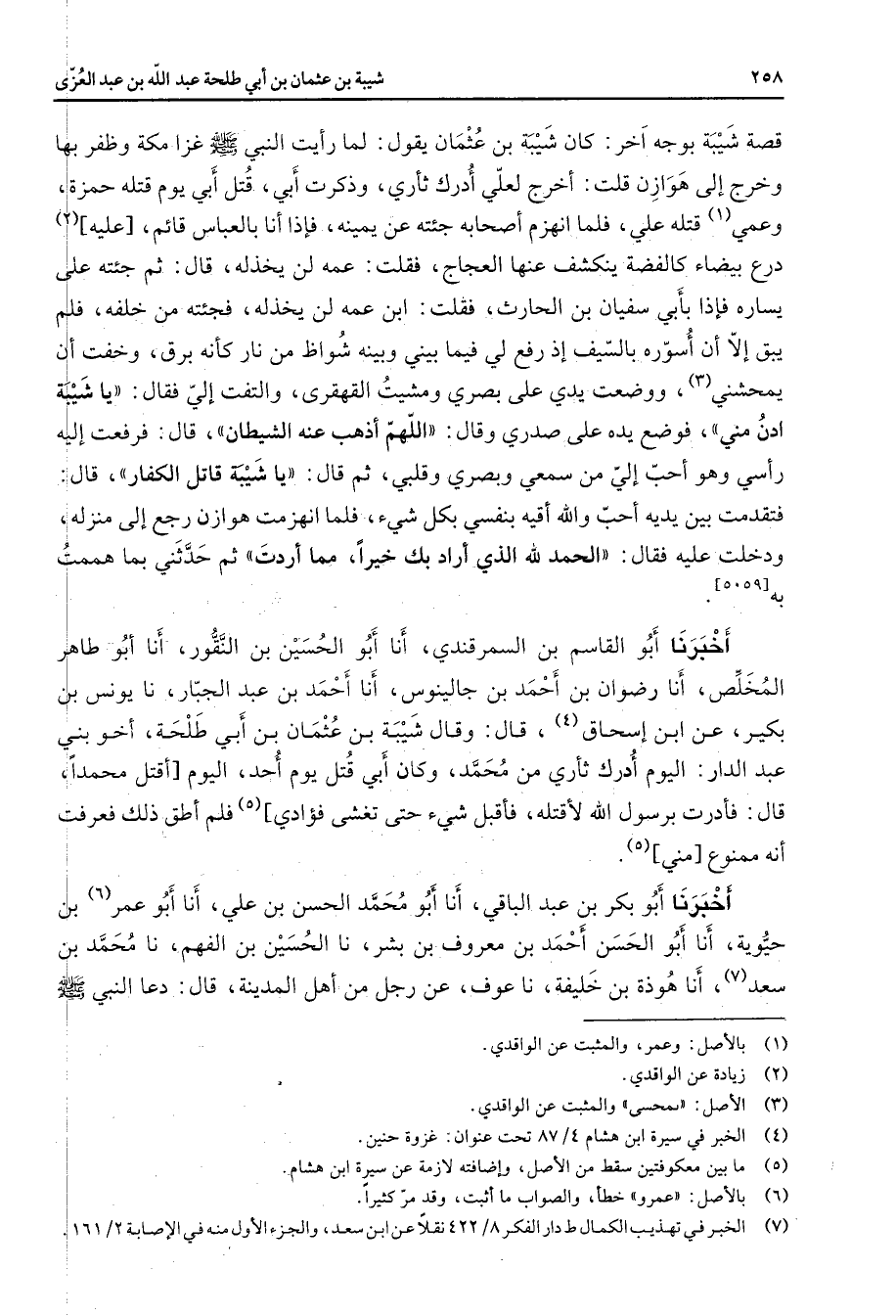 قصة شيبة بوجه آخر كان شيبة بن عثمان يقول لما رأيت النبي (صلى الله عليه وسلم) غزا مكة وظفر بها وخرج إلى هوازن قلت أخرج لعلي أدرك ثأري وذكرت أبي قتل أبي يوم قتله حمزة وعمي (1) قتله علي فلما انهزم أصحابه جئته عن يمينه فإذا أنا بالعباس قائم عليه (2) درع بيضاء كالفضة ينكشف عنها العجاج فقلت عمه لن يخذله قال ثم جئته على يساره فإذا بأبي سفيان بن الحارث فقلت ابن عمه لن يخذله فجئته من خلفه فلم يبق إلا أن أسوره بالسيف إذ رفع لي فيما بيني وبينه شواظ من نار كأنه برق وخفت أن يمحشني (3) ووضعت يدي على بصري ومشيت القهقرى والتفت إلي فقال يا شيبة ادن مني فوضع يده على صدري قال اللهم أذهب عنه الشيطان قال فرفعت إليه رأسي وهو أحب إلي من سمعي وبصري وقلبي ثم قال يا شيبة قاتل الكفار قال فتقدمت بين يديه أحب والله أقيه بنفسي بكل شئ فلما انهزمت هوازن رجع إلى منزله ودخلت عليه فقال الحمد لله الذي أراد بك خيرا مما أردت ثم حدثني بما هممت به أخبرنا أبو القاسم بن السمرقندي أنا أبو الحسين بن النقور أنا أبو طاهر المخلص أنا رضوان بن أحمد بن جالينوس أنا أحمد بن عبد الجبار نا يونس بن بكير عن ابن إسحاق (4) قال وقال شيبة بن عثمان بنأبي طلحة أخو بني عبد الدار اليوم أدرك ثأري من محمد وكان أبي قتل يوم أحد اليوم أقتل محمدا قال فأدرت برسول الله لأقتله فأقبل شئ حتى تغشى فؤادي (5) فلم أطق ذلك فعرفت أنه ممنوع مني أخبرنا أبو بكر بن عبد الباقي أنا أبو محمد الحسن بن علي أنا أبو عمر (6) بن حيوية أنا أبو الحسن أحمد بن معروف بن بشر نا الحسين بن الفهم نا محمد بن سعد (7) أنا هوذة بن خليفة نا عوف عن رجل من أهل المدينة قال دعا النبي (صلى الله عليه وسلم)