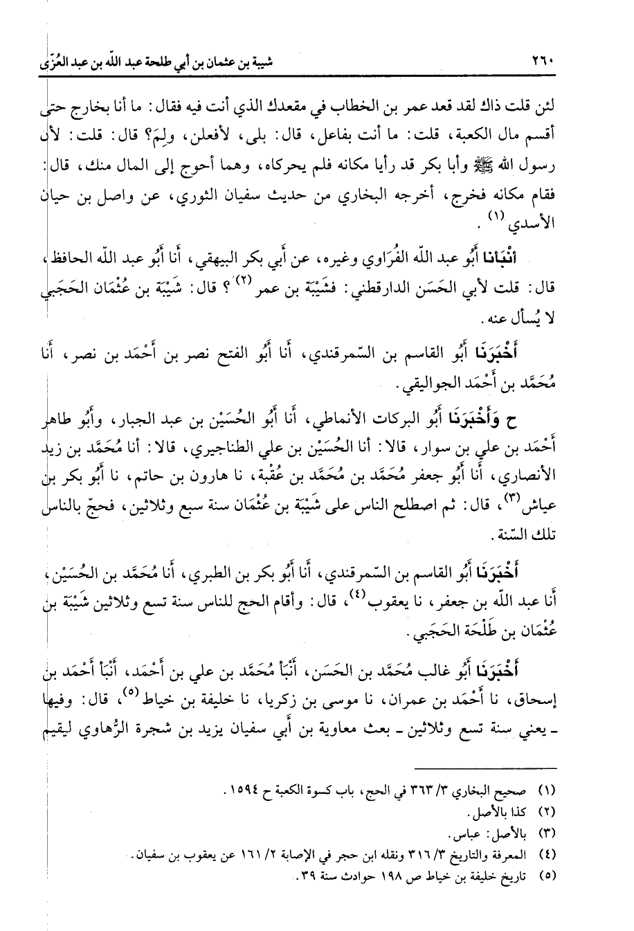 لئن قلت ذاك لقد قعد عمر بن الخطاب في مقعدك الذي أنت فيه فقال ما أنا بخارج حتى أقسم مال الكعبة قلت ما أنت بفاعل قال بلى لأفعلن ولم قال قلت لأن رسول الله (صلى الله عليه وسلم) وأبا بكر قد رأيا مكانه فلم يحركاه وهما أحوج إلى المال منك قال فقام مكانه فخرج - أخرجه البخاري - من حديث سفيان الثوري عن واصل بن حيان الأسدي (1) أنبأنا أبو عبد الله الفراوي وغيره عن أبي بكر البيهقي أنا أبو عبد الله الحافظ قال قلت لأبي الحسن الدارقطني فشيبة بن عمر (2) قال شيبة بن عثمان الحجبي لا يسأل عنه أخبرنا أبو القاسم بن السمرقندي أنا أبو الفتح نصر بن أحمد بن نصر أنا محمد بن أحمد الجواليقي ح وأخبرنا أبو البركات الأنماطي أنا أبو الحسين بن عبد الجبار وأبو طاهر أحمد بن علي بن سوار قالا أنا الحسين بن علي الطناجيري قالا أنا محمد بن زيد الأنصاري أنا أبو جعفر محمد بن محمد بن عقبة نا هارون بن حاتم نا أبو بكر بن عياش (3) قال ثم اصطلح الناس على شيبة بن عثمان سنة سبع وثلاثين فحج بالناس تلك السنة أخبرنا أبو القاسم بن السمرقندي أنا أبو بكر بن الطبري أنا محمد بن الحسين أنا عبد الله بن جعفر نا يعقوب (4) قال وأقام الحج للناس سنة تسع وثلاثين شيبة بن عثمان بن طلحة الحجبي أخبرنا أبو غالب محمد بن الحسن أنبأ محمد بن علي بن أحمد أنبأ أحمد بن إسحاق نا أحمد بن عمران نا موسى بن زكريا نا خليفة بن خياط (5) قال وفيها يعني سنة تسع وثلاثين بعث معاوية بن أبي سفيان يزيد بن شجرة الرهاوي ليقيم