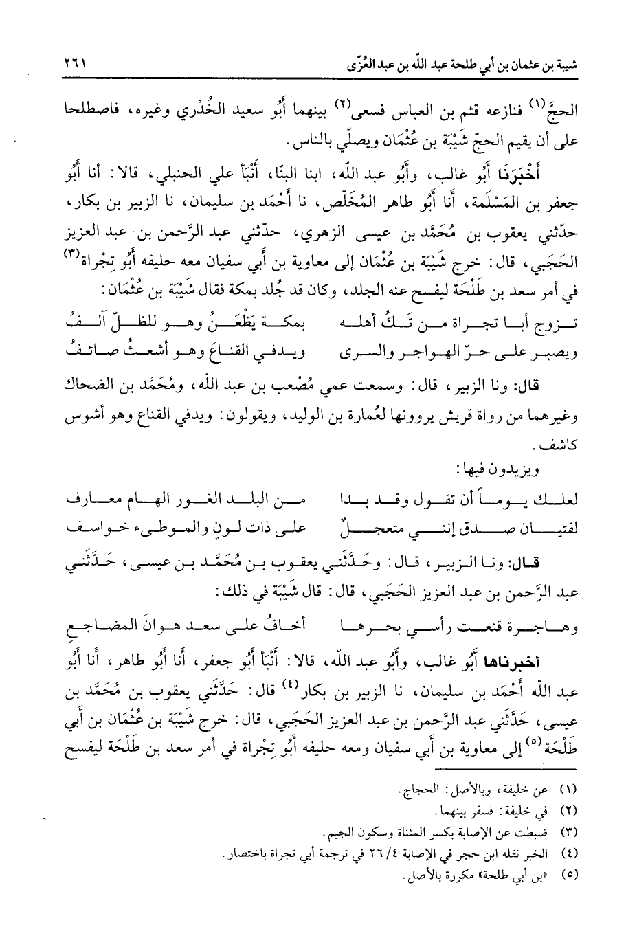 الحج (1) فنازعه قثم بن العباس فسعى (2) بينهما أبو سعيد الخدري وغيره فاصطلحا على أن يقيم الحج شيبة بن عثمان ويصلي بالناس أخبرنا أبو غالب وأبو عبد الله ابنا البنا أنبأ علي الحنبلي قالا أنا أبو جعفر بن المسلمة أنا أبو طاهر المخلص نا أحمد بن سليمان نا الزبير بن بكار حدثني يعقوب بن محمد بن عيسى الزهري حدثني عبد الرحمن بن عبد العزيز الحجبي قال خرج شيبة بن عثمان إلى معاوية بنأبي سفيان معه حليفه أبو تجراة (3) في أمر سعد بن طلحة ليفسح عنه الجلد وكان قد جلد بمكة فقال شيبة بن عثمان * تزوج أبا تجراة من تك أهله * بمكة يظعن وهو للظل آلف ويصبر على حر الهواجر والسرى * ويدفي القناع وهو أشعث صائف * قال ونا الزبير قال وسمعت عمي مصعب بن عبد الله ومحمد بن الضحاك وغيرهما من رواة قريش يروونها لعمارة بن الوليد ويقولون ويدفي القناع وهو أشوس كاشف ويزيدون فيها * لعلك يوما أن تقول وقد بدا * من البلد الغور الهام معارف لفتيان صدق إنني متعجل * على ذات لون والموطئ خواسف * قال ونا الزبير قال وحدثني يعقوب بن محمد بن عيسى حدثني عبد الرحمن بن عبد العزيز الحجبي قال قال شيبة في ذلك * وهاجرة قنعت رأسي بحرها * أخاف على سعد هوان المضاجع * أخبرناها أبو غالب وأبو عبد الله قالا أنبأ أبو جعفر أنا أبو طاهر أنا أبو عبد الله أحمد بن سليمان نا الزبير بن بكار (4) قال حدثني يعقوب بن محمد بن عيسى حدثني عبد الرحمن بن عبد العزيز الحجبي قال خرج شيبة بن عثمان بنأبي طلحة (5) إلى معاوية بنأبي سفيان ومعه حليفه أبو تجراة في أمر سعد بن طلحة ليفسح