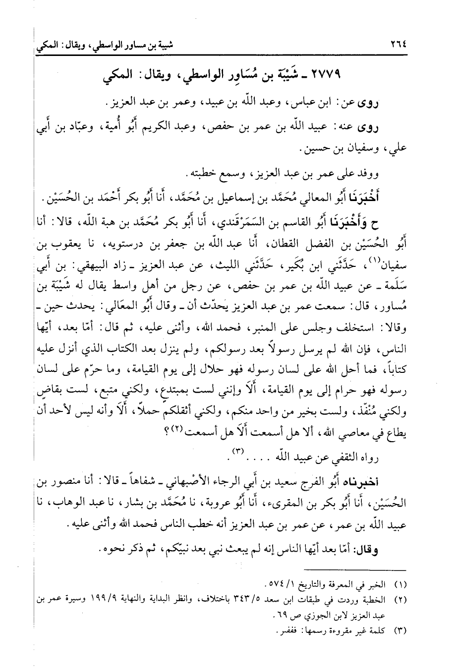 2779 - شيبة بن مساور الواسطي ويقال المكي روى عن ابن عباس وعبد الله بن عبيد وعمر بن عبد العزيز روى عنه عبيد الله بن عمر بن حفص وعبد الكريم أبو أمية وعباد بنأبي علي وسفيان بن حسين ووفد على عمر بن عبد العزيز وسمع خطبته أخبرنا أبو المعالي محمد بن إسماعيل بن محمد أنا أبو بكر أحمد بن الحسين ح وأخبرنا أبو القاسم بن السمرقندي أنا أبو بكر محمد بن هبة الله قالا أنا أبو الحسين بن الفضل القطان أنا عبد الله بن جعفر بن درستويه نا يعقوب بن سفيان (1) حدثني ابن بكير حدثني الليث عن عبد العزيز زاد البيهقي بن أبي سلمة عن عبيد الله بن عمر بن حفص عن رجل من أهل واسط يقال له شيبة بن مساور قال سمعت عمر بن عبد العزيز يحدث أن وقال أبو المعالي يحدث حين وقالا استخلف وجلس على المنبر فحمد الله وأثنى عليه ثم قال أما بعد أيها الناس فإن الله لم يرسل رسولا بعد رسولكم ولم ينزل بعد الكتاب الذي أنزل عليه كتابا فما أحل الله على لسان رسوله فهو حلال إلى يوم القيامة وما حرم على لسان رسوله فهو حرام إلى يوم القيامة ألا وإنني لست بمبتدع ولكني متبع لست بقاض ولكني منفذ ولست بخير من واحد منكم ولكني أثقلكم حملا ألا وأنه ليس لأحد أن يطاع في معاصي الله ألا هل أسمعت ألا هل أسمعت (2) رواه الثقفي عن عبيد الله (3) أخبرناه أبو الفرج سعيد بن أبي الرجاء الأصبهاني شفاها قالا أنا منصور بن الحسين أنا أبو بكر بن المقرئ أنا أبو عروبة نا محمد بن بشار نا عبد الوهاب نا عبيد الله بن عمر عن عمر بن عبد العزيز أنه خطب الناس فحمد الله وأثنى عليه وقال أما بعد أيها الناس إنه لم يبعث نبي بعد نبيكم ثم ذكر نحوه