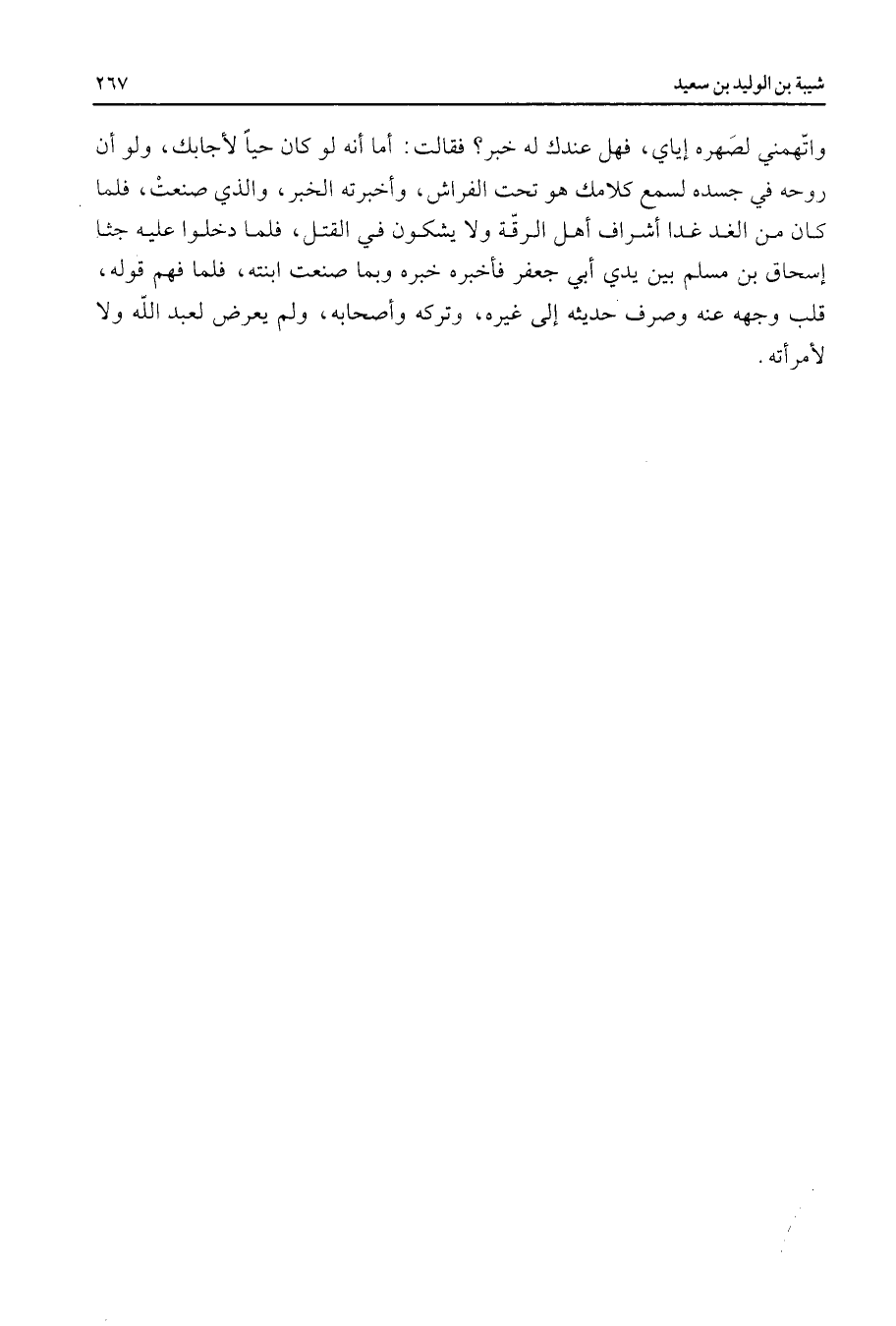 واتهمني لصهره إياي فهل عندك له خبر فقالت أما أنه لو كان حيا لأجابك ولو أن روحه في جسده لسمع كلامك وهو تحت الفراش وأخبرته الخبر والذي صنعت فلما كان من الغد غدا أشراف أهل الرقة ولا يشكون في القتل فلما دخلوا عليه جثا إسحاق بن مسلم بين يدي أبي جعفر فأخبره خبره وبما صنعت ابنته فلما فهم قوله قلب وجهه عنه وصرف حديثه إلى غيره وتركه وأصحابه ولم يعرض لعبد الله ولا لأمرأته