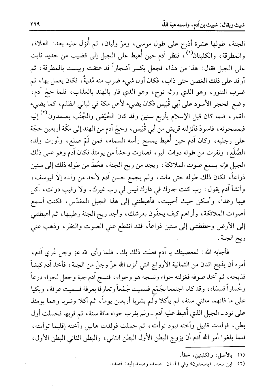 الجنة طولها عشرة أذرع على طول موسى ومر ولبان ثم أنزل عليه بعد العلاة والمطرقة والكلبتان (1) فنظر آدم حين أهبط عل الجبل إلى قضيب من حديد نابت على الجبل فقال هذا من هذا فجعل يكسر أشجارا قد عتقت ويبست بالمطرقة ثم أوقد على ذلك الغصن حتى ذاب فكان أول شئ ضرب منه مدية فكان يعمل بها ثم ضرب التنور وهو الذي ورثه نوح وهو الذي فار بالهند بالعذاب فلما حج آدم وضع الحجر الأسود على أبي قبيس فكان يضئ لأهل مكة في ليالي الظلم كما يضئ القمر فلما كان قبل الإسلام بأربع سنين وقد كان الحيض والجنب يصمدون (2) إليه فيمسحونه فاسود فأنزلته قريش من أبي قبيس وحج آدم من الهند إلى مكة أربعين حجة على رجليه وكان آدم حين أهبط يمسح رأسه السماء فمن ثم صلع وأورث ولده الصلع ونفرت من طوله دواب البر فصارت وحشا من يومئذ فكان آدم وهو على ذلك الجبل فإنه يسمع صوت الملائكة ويجد من ريح الجنة فحط من طوله ذلك إلى ستين ذراعا فكان ذلك طوله حتى مات ولم يجمع حسن آدم لأحد من ولده إلا ليوسف وأنشأ آدم يقول رب كنت جارك في دارك ليس لي رب غيرك ولا رقيب دونك آكل فيها رغدا وأسكن حيث أحببت فأهبطتني إلى هذا الجبل المقدس فكنت أسمع أصوات الملائكة وأراهم كيف يحفون بعرشك وأجد ريح الجنة وطيبها ثم أهبطتني إلى الأرض وحططتني إلى ستين ذراعا فقد انقطع عني الصوت والنظر وذهب عني ريح الجنة فأجابه الله لمعصيتك يا آدم فعلت ذلك بك فلما رأى الله عز وجل عري آدم أمره أن يذبح اثنان من الثمانية الأزواج التي أنزل الله عز وجل من الجنة فأخذ آدم كبشا فذبحه ثم أخذ صوفه فغزلته حواء ونسجه هو وحواء فنسج آدم جبة وجعل لحواء درعا وخمارا فلبساه وقد كانا اجتمعا بجمع فسميت جمعا وتعارفا بعرفة فسميت عرفة وبكيا على ما فاتهما مائتي سنة لم يأكلا ولم يشربا أربعين يوما ثم أكلا وشربا وهما يومئذ على نود الجبل الذي أهبط عليه آدم ولم يقرب حواء مائة سنة ثم قربها فحملت أول بطن فولدت قابيل وأخته لبود توأمته ثم حملت فولدت هابيل وأخته إقليما توأمته فلما بلغوا أمر الله آدم أن يزوج البطن الأول البطن الثاني والبطن الثاني البطن الأول