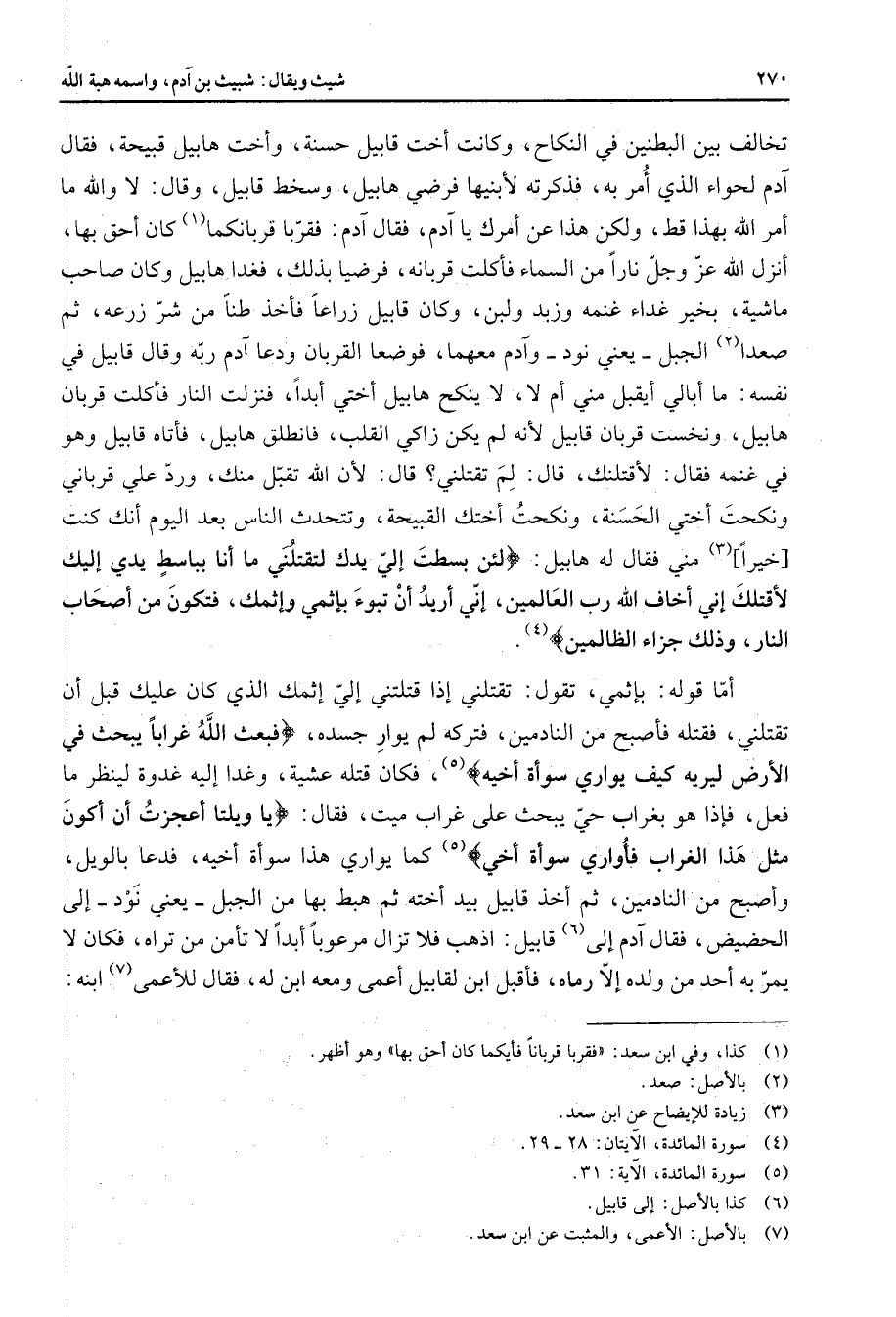 تخالف بين البطنين في النكاح وكانت أخت قابيل حسنة وأخت هابيل قبيحة فقال آدم لحواء الذي أمر به فذكرته لأبنيها فرضي هابيل وسخط قابيل وقال لا والله ما أمر الله بهذا قط ولكن هذا عن أمرك يا آدم فقال آدم فقربا قربانكما (1) كان أحق بها أنزل الله عز وجل نارا من السماء فأكلت قربانه فرضيا بذلك فغدا هابيل وكان صاحب ماشية بخير غداء غنمه وزبد ولبن وكان قابيل زراعا فأخذ طنا من شر زرعه ثم صعدا (2) الجبل يعني نود وآدم معهما فوضعا القربان ودعا آدم ربه وقال قابيل في نفسه ما أبالي أيقبل مني أم لا لا ينكح هابيل أختي أبدا فنزلت النار فأكلت قربان هابيل ونخست قربان قابيل لأنه لم يكن زاكي القلب فانطلق هابيل فأتاه قابيل وهو في غنمه فقال لأقتلنك قال لم تقتلني قال لأن الله تقبل منك ورد علي قرباني ونكحت أختي الحسنة ونكحت أختك القبيحة وتتحدث الناس بعد اليوم أنك كنت خيرا (3) مني فقال له هابيل " لئن بسطت إلي يدك لتقتلني ما أنا بباسط يدي إليك لأقتلك إني أخاف الله رب العالمين إني أريد أن تبوء بإثمي وإثمك فتكون من أصحاب النار وذلك جزاء الظالمين " (4) أما قوله بإثمي تقول تقتلني إذا قتلتني إلي إثمك الذي كان عليك قبل أن تقتلني فقتله فأصبح من النادمين فتركه لم يوار جسده " فبعث الله غرابا يبحث في الأرض ليريه كيف يواري سوأة أخيه " (5) فكان قتله عشية وغدا إليه غدوة لينظر ما فعل فإذا هو بغراب حي يبحث على غراب ميت فقال " يا ويلتا أعجزت أن أكون مثل هذا الغراب فأواري سوأة أخي " (5) كما يواري هذا سوأة أخيه فدعا بالويل وأصبح من النادمين ثم أخذ قابيل بيد أخته ثم هبط بها من الجبل يعني نود إلى الحضيض فقال آدم (6) إلى قابيل اذهب فلا تزال مرعوبا أبدا لا تأمن من تراه فكان لا يمر به أحد من ولده إلا رماه فأقبل ابن لقابيل أعمى ومعه ابن له فقال للأعمى (7) ابنه