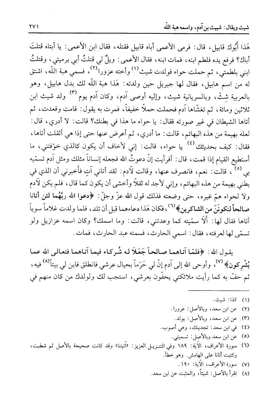هذا أبوك قابيل قال فرمى الأعمى أباه قابيل فقتله فقال ابن الأعمى يا أبتاه قتلت أباك فرفع يده فلطم ابنه فمات ابنه فقال الأعمى ويل لي قتلت أبي برميتي وقتلت ابني بلطمتي ثم حملت حواء فولدت شيث (1) وأخته عزورا (2) فسمي هبة الله اشتق له من اسم هابيل فقال لها جبريل حين ولدته هذا هبة الله لك بدل هابيل وهو بالعربية شث وبالسريانية شيث وإليه أوصى آدم وكان آدم يوم (3) ولد شيث ابن ثلاثين ومائة ثم تغشاها آدم فحملت حملا خفيفا فمرت به يقول قامت وقعدت ثم أتاها الشيطان في غير صورته فقال يا حواء ما هذا في بطنك قالت لا أدري قال لعله بهيمة من هذه البهائم قالت ما أدري ثم أعرض عنها حتى إذا هي أثقلت أتاها فقال كيف بحديثك (4) يا حواء قالت إني لأخاف أن يكون كالذي خوفتني ما أستطيع القيام إذا قمت قال أفرأيت إن دعوت الله فجعله إنسانا مثلك ومثل آدم تسميه بي (5) قالت نعم فانصرف عنها وقالت لآدم لقد أتاني آت فأخبرني أن الذي في بطني بهيمة من هذه البهائم وإني لأجد له ثقلا وأخشى أن يكون كما قال فلم يكن لآدم ولا لحواء هم غيره حتى وضعته فذلك قول الله عز وجل " دعوا الله ربهما لئن أتانا صالحا لنكونن من الشاكرين " (6) فكان هذا دعاءهما قبل أن تلد فلما ولدت غلاما سويا أتاها فقال لها ألا سميته كما وعدتني قال وما اسمك وكان اسمه عزازيل ولو تسمى لها لعرفته فقال اسمي الحارث فسمته عبد الحارث فمات يقول الله " فلما آتاهما صالحا جعلا له شركاء فيما آتاهما فتعالى الله عما يشركون " (7) وأوحى الله إلى آدم إن لي حرما بحيال عرشي فانطلق فابن لي بيتا (8) فيه ثم حف به كما رأيت ملائكتي يحفون بعرشي استجب لك ولولدك من كان منهم في