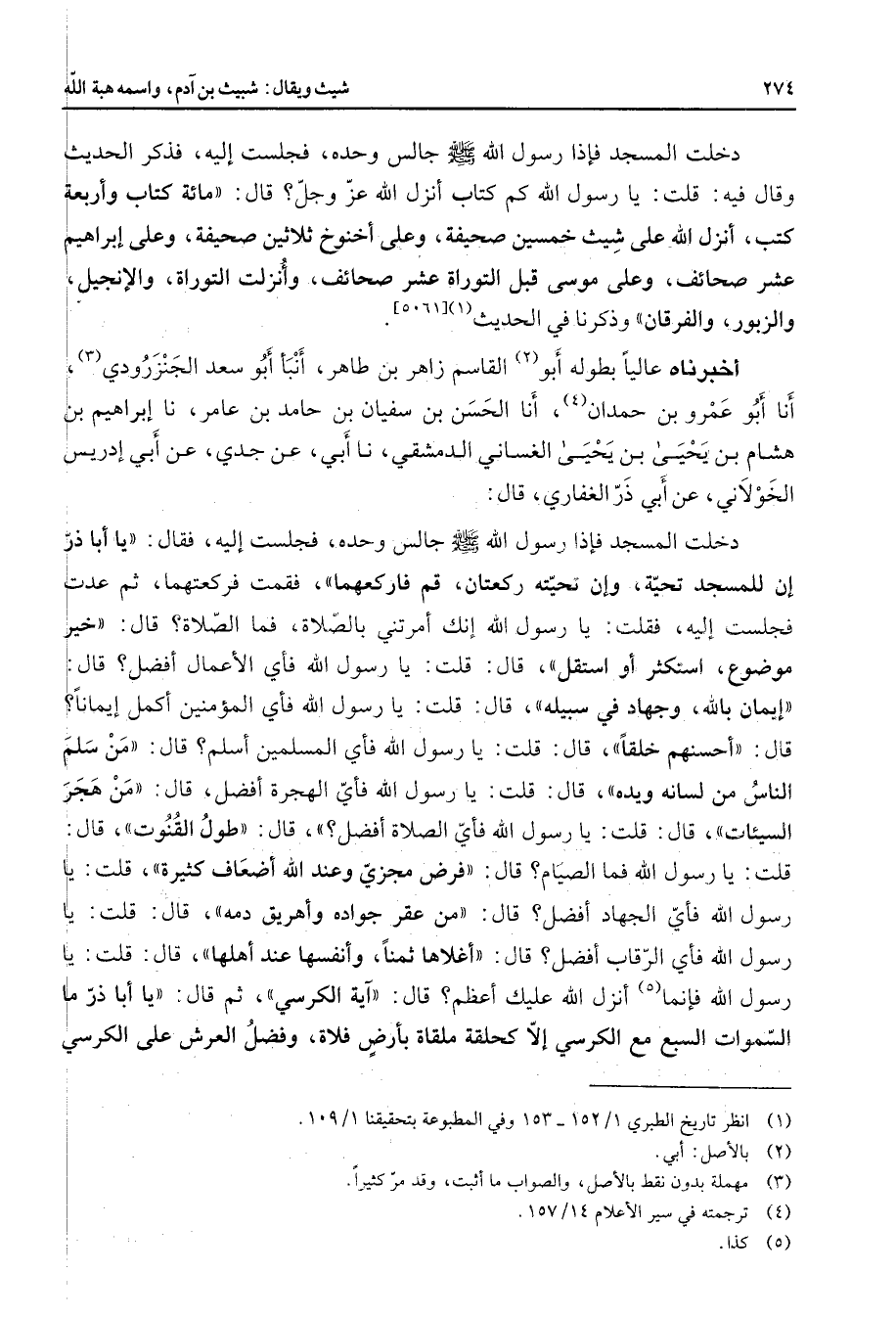 دخلت المسجد فإذا رسول الله (صلى الله عليه وسلم) جالس وحده فجلست إليه فذكر الحديث وقال فيه قلت يا رسول الله كم كتاب أنزل الله عز وجل قال مائة كتاب وأربعة كتب أنزل الله على شيث خمسين صحيفة وعلى أخنوخ ثلاثين صحيفة وعلى إبراهيم عشر صحائف وعلى موسى قبل التوراة عشر صحائف وأنزلت التوراة والإنجيل والزبور والفرقان وذكرنا في الحديث ()