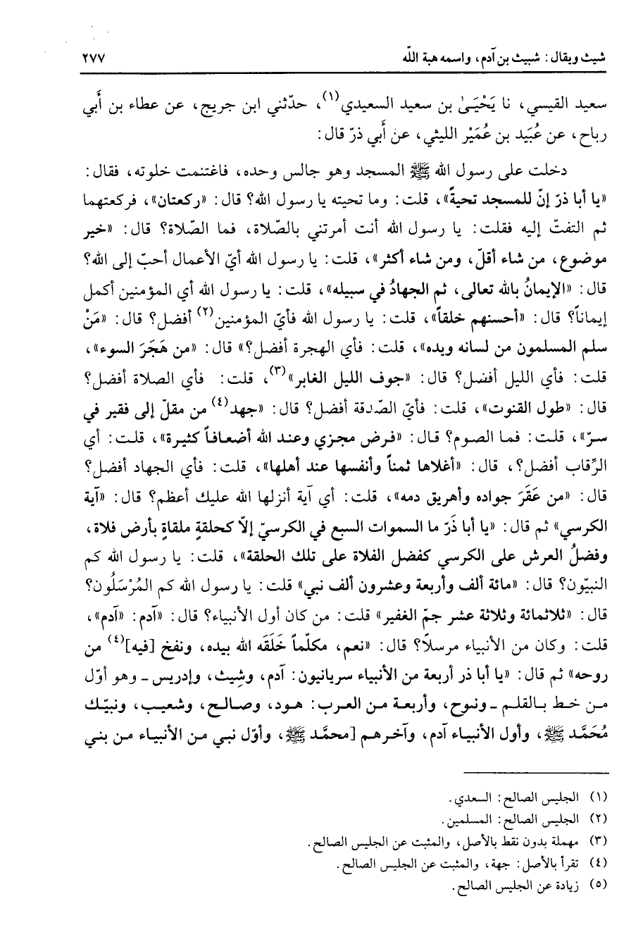 سعيد القيسي نا يحيى بن سعد السعيدي (1) حدثني ابن جريج عن عطاء بن أبي رياح عن عبيد بن عمير الليثي عن أبي ذر قال دخلت على رسول الله (صلى الله عليه وسلم) المسجد وهو جالس وحده فاغتنمت خلوته فقال يا أبا ذر إن للمسجد تحية قلت وما تحيته يا رسول الله قال ركعتان فركعتهما ثم التفت إليه فقلت يا رسول الله أنت أمرتني بالصلاة فما الصلاة قال خير موضوع من شاء أقل ومن شاء أكثر قلت يا رسول الله أي الأعمال أحب إلى الله قال الإيمان بالله تعالى ثم الجهاد في سبيله قلت يا رسول الله أي المؤمنين أكمل إيمانا قال أحسنهم خلقا قلت يا رسول الله فأي المؤمنين (2) أفضل قال من سلم المسلمون من لسانه ويده قلت فأي الهجرة أفضل قال من هجر السوء قلت فأي الليل أفضل قال جوف الليل الغابر (3) قلت فأي الصلاة أفضل قال طول القنوت قلت فاي الصدقة أفضل قال جهد (4) من مقل إلى فقير في سر قلت فما الصوم قال فرض مجزي وعند الله أضعافا كثيرة قلت أي الرقاب أفضل قال أغلاها ثمنا وأنفسها عند أهلها قلت فأي الجهاد أفضل قال من عقر جواده وأهريق دمه قلت أي آية أنزلها الله عليك أعظم قالآية الكرسي ثم قال يا أبا ذر ما السموات السبع في الكرسي إلا كحلقة ملقاة بأرض فلاة وفضل العرش على الكرسي كفضل الفلاة على تلك الحلقة قلت يا رسول الله كم النبيون قال مائة ألف وأربعة وعشرون ألف نبي قلت يا رسول الله كم المرسلون قال ثلاثمائة وثلاثة عشر جم الغفير قلت من كان أول الأنبياء قال آدم آدم قلت وكان من الأنبياء مرسلا قال نعم مكلما خلقه الله بيده ونفخ فيه (5) من روحه ثم قال يا أبا ذر أربعة من الأنبياء سريانيون آدم وشيث وإدريس وهو أول من خط بالقلم ونوح وأربعة من العرب هود وصالح وشعيب ونبيك محمد (صلى الله عليه وسلم) وأول الأنبياء آدم وآخرهم محمد (صلى الله عليه وسلم) وأول نبي من الأنبياء من بني