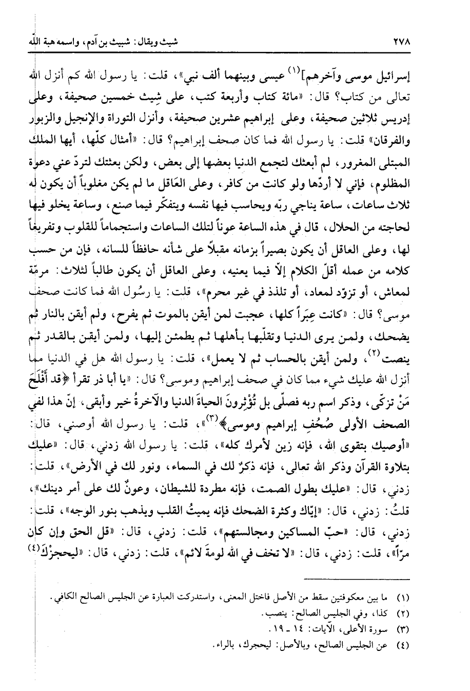 إسرائيل موسى وآخرهم (1) عيسى وبينهما ألف نبي قلت يا رسول الله كم أنزل الله تعالى من كتاب قال مائة كتاب وأربعة كتب على شيث خمسين صحيفة وعلى إدريس ثلاثين صحيفة وعلى إبراهيم عشرين صحيفة وأنزل التوراة والإنجيل والزبور والفرقان قلت يا رسول الله فما كان صحف إبراهيم قال أمثال كلها أيها الملك المبتلى المغرور لم أبعثك لتجمع الدنيا بعضها إلى بعض ولكن بعثتك لترد عني دعوة المظلوم فإني لا أردها ولو كانت من كافر وعلى العاقل ما لم يكن مغلوبا أن يكون له ثلاث ساعات ساعة يناجي ربه ويحاسب فيها نفسه ويتفكر فيما صنع وساعة يخلو فيها لحاجته من الحلال قال في هذه الساعة عونا لتلك الساعات واستجماما للقلوب وتفريغا لها وعلى العاقل أن يكون بصيرا بزمانه مقبلا على شأنه حافظا للسانه فإن من حسب كلامه من عمله أقل الكلام إلا فيما يعنيه وعلى العاقل أن يكون طالبا لثلاث مرمة لمعاش أو تزود لمعاد أو تلذذ في غير محرم قلت يا رسول الله فما كانت صحف موسى قال كانت عبرا كلها عجبت لمن أيقن بالموت ثم يفرح ولم أيقن بالنار ثم يضحك ولمن يرى الدنيا وتقلبها بأهلها ثم يطمئن إليها ولمن أيقن بالقدر ثم ينصت (2) ولمن أيقن بالحساب ثم لا يعمل قلت يا رسول الله هل في الدنيا مما أنزل الله عليك شئ مما كان في صحف إبراهيم وموسى قال يا أبا ذر تقرأ " قد أفلح من تزكى وذكر اسم ربه فصلى بل تؤثرون الحياة الدنيا والآخرة خير وأبقى إن هذا لفي الصحف الأولى صحف إبراهيم وموسى " (3) قلت يا رسول الله أوصني قال أوصيك بتقوى الله فإنه زين لأمرك كله قلت يا رسول الله زدني قال عليك بتلاوة القرآن وذكر الله تعالى فإنه ذكر لك في السماء ونور لك في الأرض قلت زدني قال عليك بطول الصمت فإنه مطردة للشيطان وعون لك على أمر دينك قلت زدني قال إياك وكثرة الضحك فإنه يميت القلب ويذهب بنور الوجه قلت زدني قال حب المساكين ومجالستهم قلت زدني قال قل الحق وإن كان مرا قلت زدني قال لا تخف في الله لومة لائم قلت زدني قال ليحجزك (4)