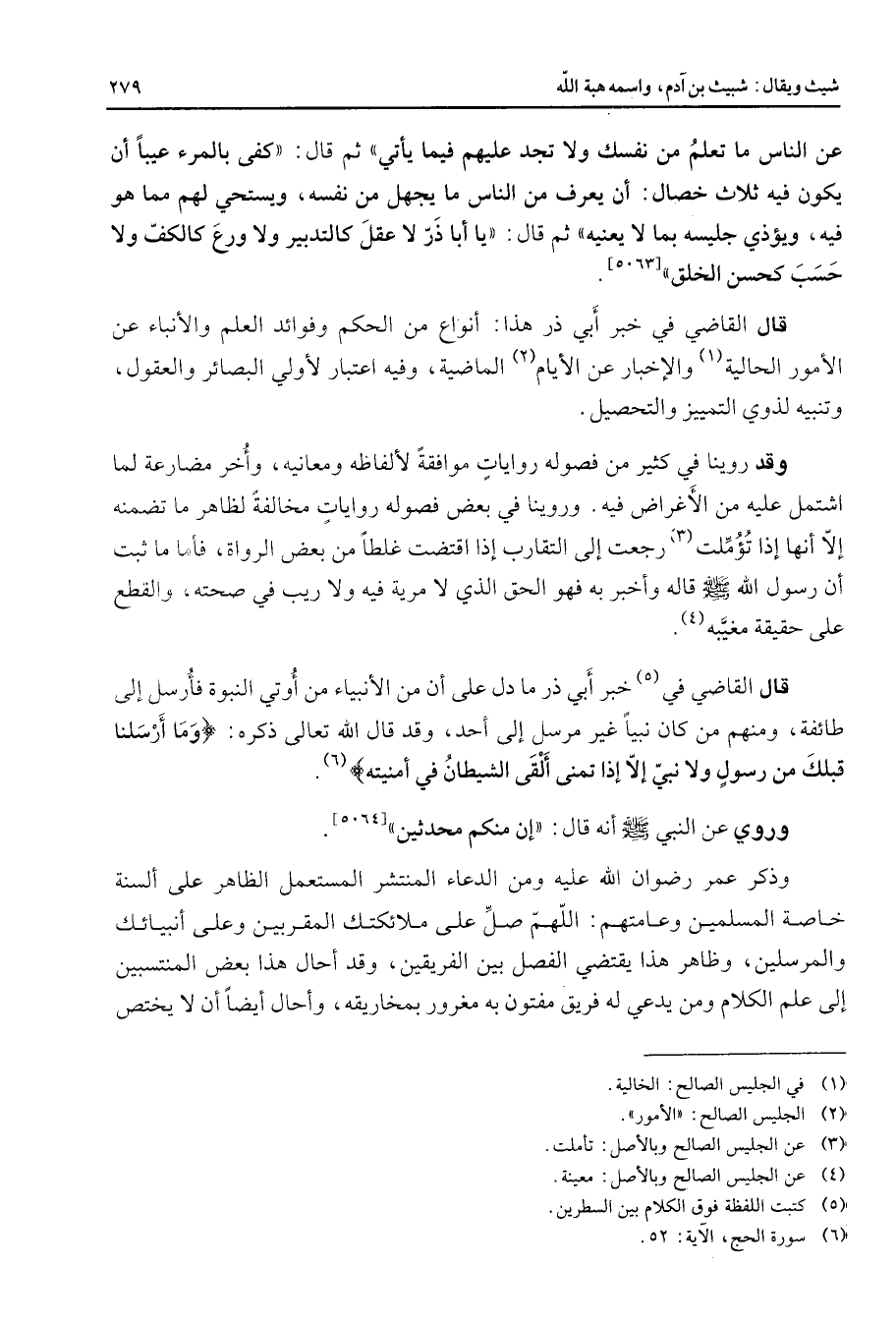 عن الناس ما تعلم من نفسك ولا تجد عليهم فيما يأتي ثم قال كفى بالمرء عيبا أن يكون فيه ثلاث خصال أن يعرف من الناس ما يجهل من نفسه ويستحي لهم مما هو فيه ويؤذي جليسه بما لا يعنيه ثم قال يا أبا ذر لا عقل كالتدبير ولا ورع كالكف ولا حسب كحسن الخلق قال القاضي في خبر أبي ذر هذا أنواع من الحكم وفوائد العلم والأنباء عن الأمور الحالية (1) والإخبار عن الأيام (2) الماضية وفيه اعتبار لأولي البصائر والعقول وتنبيه لذوي التمييز والتحصيل وقد روينا في كثير من فصوله روايات موافقة لألفاظه ومعانيه وأخر مضارعة لما اشتمل عليه من الأغراض فيه وروينا في بعض فصوله روايات مخالفة لظاهر ما تضمنه إلا أنها إذا تؤملت (3) رجعت إلى التقارب إذا اقتضت غلطا من بعض الرواة فأما ما ثبت أن رسول الله (صلى الله عليه وسلم) قاله وأخبر به فهو الحق الذي لا مرية فيه ولا ريب في صحته والقطع على حقيقة مغيبه (4) قال القاضي في (5) خبر أبي ذر ما دل على أن من الأنبياء من أوتي النبوة فأرسل إلى طائفة ومنهم من كان نبيا غير مرسل إلى أحد وقد قال الله تعالى ذكره " وما أرسلنا قبلك من رسول ولا نبي إلا إذا تمنى ألقى الشيطان في أمنيته " (6) وروي عن النبي (صلى الله عليه وسلم) أنه قال إن منكم محدثين وذكر عمر رضوان الله عليه ومن الدعاء المنتشر المستعمل الظاهر على ألسنة خاصة المسلمين وعامتهم اللهم صل على ملائكتك المقربين وعلى أنبيائك والمرسلين وظاهر هذا يقتضي الفصل بين الفريقين وقد أحال هذا بعض المنتسبين إلى علم الكلام ومن يدعي له فريق مفتون به مغرور بمخاريقه وأحال أيضا أن لا يختص