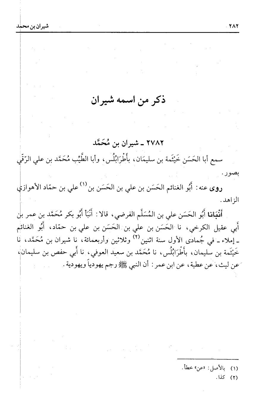 2782 - شيران بن محمد سمع أبا الحسن خيثمة بن سليمان بأطرابلس وأبا الطيب محمد بن علي الرقي بصور روى عنه أبو الغنائم الحسن بن علي بن الحسن بن (1) علي بن حماد الأهوازي الزاهد أنبأنا أبو الحسن بن علي بن المسلم الفرضي قالا أنبأ أبو بكر محمد بن عمر بن أبي عقيل الكرخي نا الحسن بن علي بن الحسن بن علي بن حماد أبو الغنائم إملاء في جمادى الأول سنة اثنين (2) وثلاثين وأربعمائة نا شيران بن محمد نا خيثمة بن سليمان بأطرابلس نا محمد بن سعيد العوفي نا أبي حفص بن سليمان عن ليث عن عطية عن ابن عمر أن النبي (صلى الله عليه وسلم) رجم يهوديا ويهودية