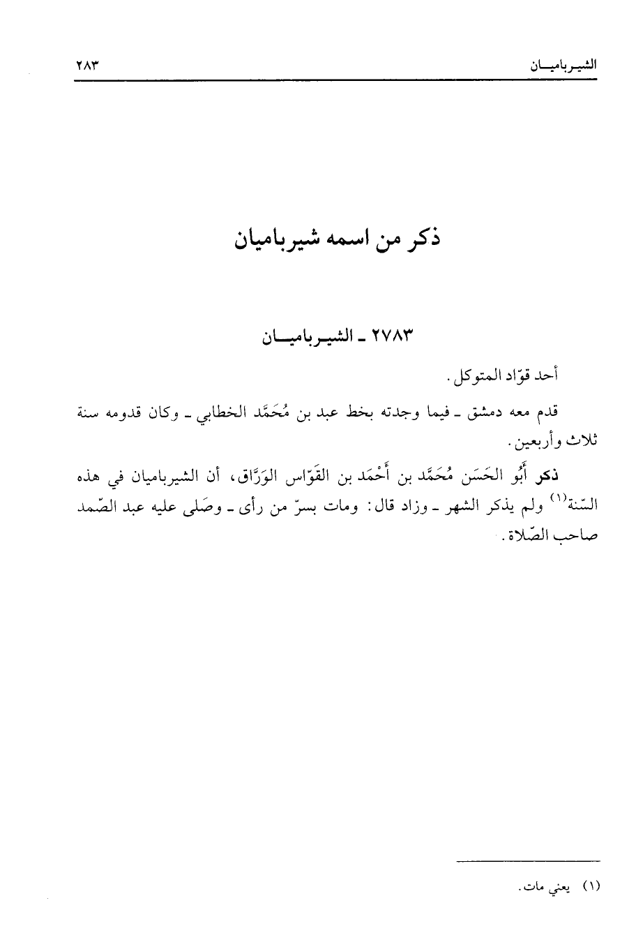 2783 - الشير باميان أحد قواد المتوكل قدم معه دمشق فيما وجدته بخط عبد بن محمد الخطابي وكان قدومه سنة ثلاث وأربعين ذكر أبو الحسن محمد بن أحمد بن القواس الوراق أن الشير باميان في هذه السنة (1) ولم يذكر الشهر وزاد قال ومات بسر من رأى وصلى عليه عبد الصمد صاحب الصلاة