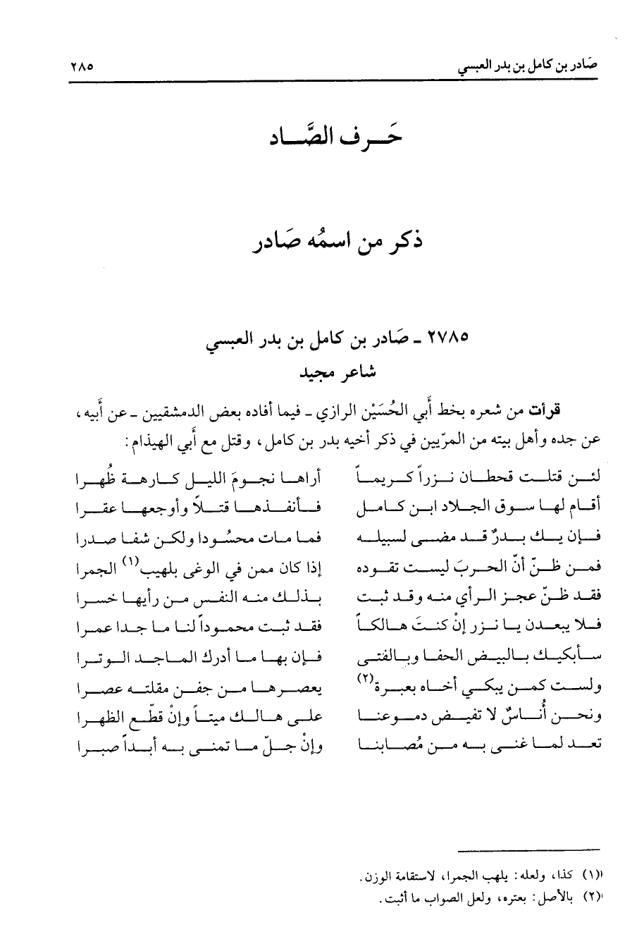 2785 - صادر بن كامل بن بدر العبسي شاعر مجيد قرأت من شعره بخط أبي الحسين الرازي فيما أفاده بعض الدمشقيين عنأبيه عن جده وأهل بيته من المريين في ذكر أخيه بدر بن كامل وقتل مع أبي الهيذام * لئن قتلت قحطان نزرا كريما * أراها نجوم الليل كارهة ظهرا أقام لها سوق الجلاد ابن كامل * فأنفذها قتلا وأوجعها عقرا فإن يك بدر قد مضى لسبيله * فما مات محشودا ولكن شفا صدرا فمن ظن أن الحرب ليست تقوده * إذا كان ممن في الوغى بلهيب (1) الجمرا فقد ظن عجز الرأي منه وقد ثبت * بذلك منه النفس من رأيها خسرا فلا يبعدن يا نزر إن كنت هالكا * فقد ثبت محمودا لنا ما جدا عمرا سأبكيك بالبيض الحفا وبالفتى * فإن بها ما أدرك الماجد الوترا ولست كمن يبكي أخاه بعبرة (2) * يعصرها من جفن مقلته عصرا ونحن أناس لا تفيض دموعنا * على هالك ميتا وإن قطع الظهرا تعد لما غنى به من مصابنا * وإن جل ما تمنى به أبدا صبرا *