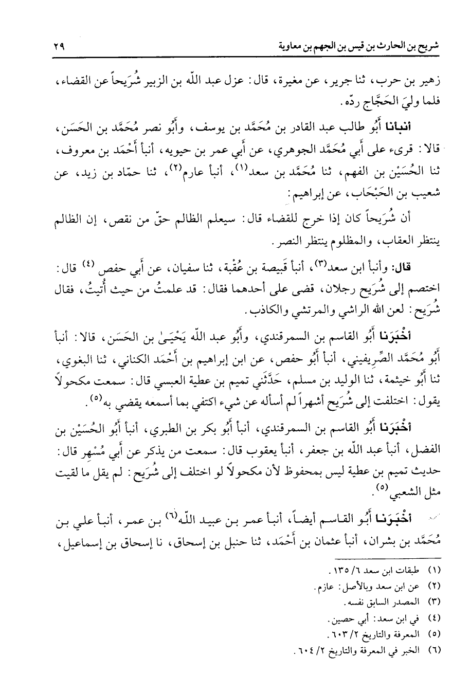 زهير بن حرب ثنا جرير عن مغيرة قال عزل عبد الله بن الزبير شريحا عن القضاء فلما ولي الحجاج رده أنبأنا أبو طالب عبد القادر بن محمد بن يوسف وأبو نصر محمد بن الحسن قالا قرئ على أبي محمد الجوهري عن أبي عمر بن حيويه أنبأ أحمد بن معروف ثنا الحسين بن الفهم ثنا محمد بن سعد (1) أنبأ عارم (2) ثنا حماد بن زيد عن شعيب بن الحبحاب عن إبراهيم أن شريحا كان إذا خرج للقضاء قال سيعلم الظالم حق من نقص إن الظالم ينتظر العقاب والمظلوم ينتظر النصر قال وأنبأ ابن سعد (3) أنبأ قبيصة بن عقبة ثنا سفيان عن أبي حفص قال اختصم إلى شريح رجلان قضى على أحدهما فقال قد علمت من حيث أتيت فقال شريح لعن الله الراشي والمرتشي والكاذب أخبرنا أبو القاسم بن السمرقندي وأبو عبد الله يحيى بن الحسن قالا أنبأ أبو محمد الصريفيني أنبأ أبو حفص عن ابن إبراهيم بن أحمد الكناني ثنا البغوي ثنا أبو خيثمة ثنا الوليد بن مسلم حدثني تميم بن عطية العبسي قال سمعت مكحولا يقول اختلفت إلى شريح أشهرا لم أسأله عن شئ اكتفي بما أسمعه يقضي به (5) أخبرنا أبو القاسم بن السمرقندي أنبأ أبو بكر بن الطبري أنبأ أبو الحسين بن الفضل أنبأ عبد الله بن جعفر أنبأ يعقوب قال سمعت من يذكر عن أبي مسهر قال حديث تميم بن عطية ليس بمحفوظ لأن مكحولا لو اختلف إلى شريح لم يقل ما لقيت مثل الشعبي أخبرنا أبو القاسم أيضا أنبأ عمر بن عبيد الله (6) بن عمر أنبأ علي بن محمد بن بشران أنبأ عثمان بن أحمد ثنا حنبل بن إسحاق نا إسحاق بن إسماعيل