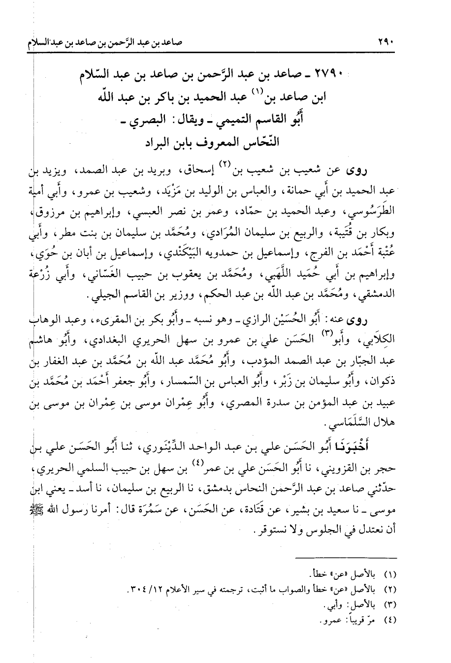 2790 - صاعد بن عبد الرحمن بن صاعد بن عبد السلام ابن صاعد بن (1) عبد الجميد بن باكر بن عبد الله أبو القاسم التميمي ويقال البصري النحاس المعروف بابن البراد روى عن شعيب بن شعيب بن (2) إسحاق وبريد بن عبد الصمد ويزيد بن عبد الحميد بن أبي حمانة والعباس بن الوليد بن مزيد وشعيب بن عمرو وأبي أمية الطرسوسي وعبد الحميد بن حماد وعمر بن نصر العبسي وإبراهيم بن مرزوق وبكار بن قتيبة والربيع بن سليمان المرادي ومحمد بن سليمان بن بنت مطر وأبي عتبة أحمد بن الفرج وإسماعيل بن حمدويه البيكندي وإسماعيل بن أبان بن حوي وإبراهيم بن أبي حميد اللهبي ومحمد بن يعقوب بن حبيب الغساني وأبي زرعة الدمشقي ومحمد بن عبد الله بن عبد الحكم ووزير بن القاسم الجيلي روى عنه أبو الحسين الرازي وهو نسبه وأبو بكر بن المقرئ وعبد الوهاب الكلابي وأبو (3) الحسن علي بن عمرو بن سهل الحريري البغدادي وأبو هاشم عبد الجبار بن عبد الصمد المؤدب وأبو محمد عبد الله بن محمد بن عبد الغفار بن ذكوان وأبو سليمان بن زبر وأبو العباس بن السمسار وأبو جعفر أحمد بن محمد بن عبيد بن عبد المؤمن بن سدرة المصري وأبو عمران موسى بن عمران بن موسى بن هلال السلماسي أخبرنا أبو الحسن علي بن عبد الواحد الدينوري ثنا أبو الحسن علي بن حجر بن القزويني نا أبو الحسن علي بن عمر (4) بن سهل بن حبيب السلمي الحريري حدثني صاعد بن عبد الرحمن النحاس بدمشق نا الربيع بن سليمان نا أسد يعني ابن موسى نا سعيد بن بشير عن قتادة عن الحسن عن سمرة قال أمرنا رسول الله (صلى الله عليه وسلم) أن نعتدل في الجلوس ولا نستوقر