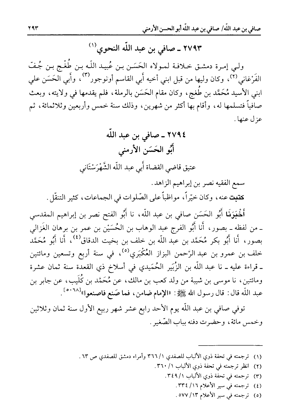 2793 - صافي بن عبد الله النحوي (1) ولي إمرة دمشق خلافه لمولاه الحسن بن عبيد الله بن طغج بن جف الفرغاني (2) وكان وليها من قبل ابني أخيه أبي القاسم أونوجور (3) وأبي الحسن علي ابني الأسيد محمد بن طغج وكان مقام الحسن بالرملة فلم يقدمها في ولايته وبعث صافيا فتسلمها له وأقام بها أكثر من شهرين وذلك سنة خمس وأربعين وثلاثمائة ثم عزل عنها