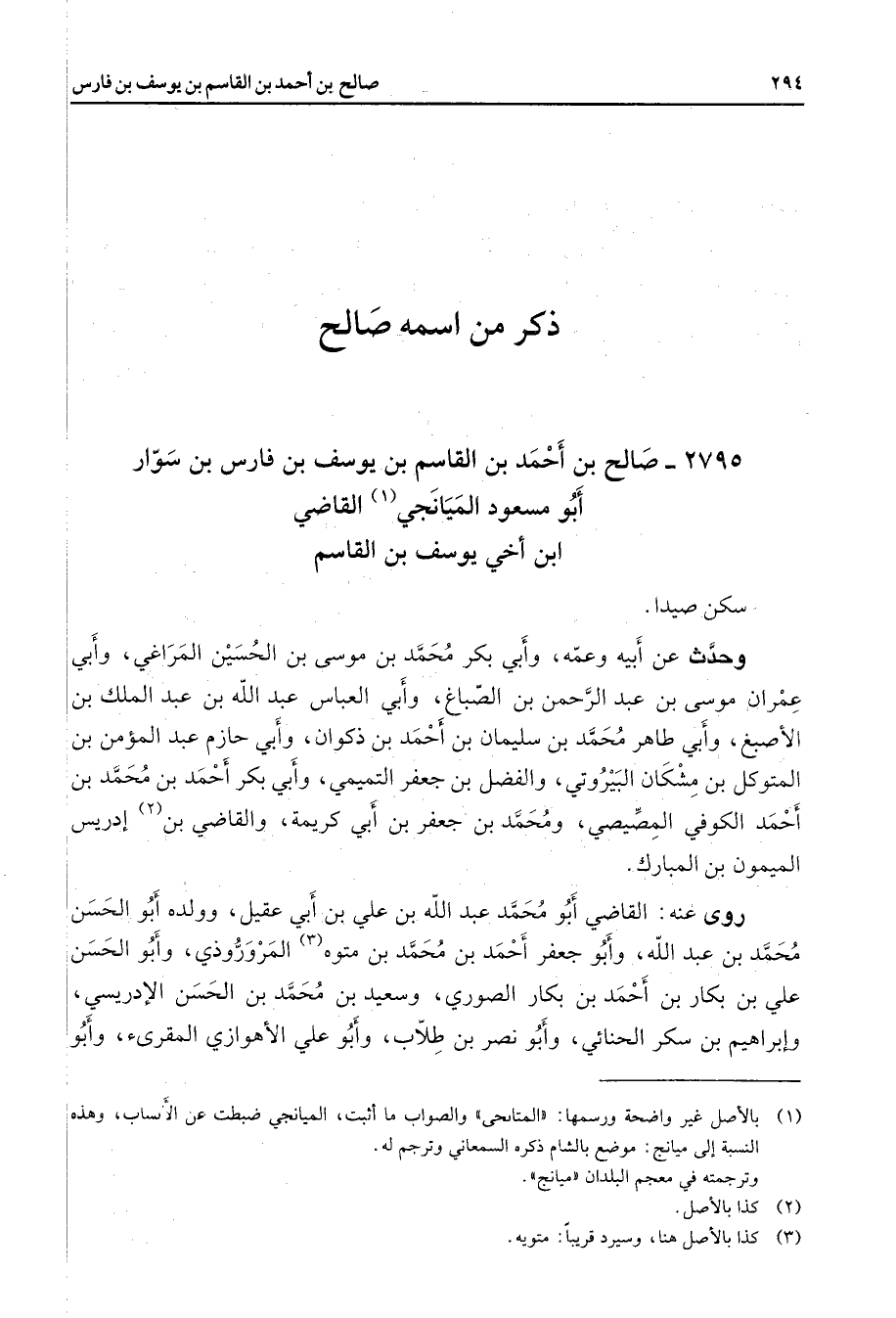 2795 - صالح بن أحمد بن القاسم بن يوسف بن فارس بن سوار أبو مسعود الميانجي (1) القاضي ابن أخي يوسف القاسم سكن صيدا وحدث عن أبيه وعمه وأبي بكر محمد بن موسى بن الحسين المراغي وأبي عمران موسى بن عبد الرحمن بن الصباغ وأبي العباس عبد الله بن عبد الملك بن الأصبغ وأبي طاهر محمد بن سليمان بن أحمد بن ذكوان وأبي حازم عبد المؤمن بن المتوكل بن مشكان البيروتي والفضل بن جعفر التميمي وأبي بكر أحمد بن محمد بن أحمد الكوي المصيصي ومحمد بن جعفر بن أبي كريمة والقاضي بن (2) إدريس الميمون بن المبارك روى عنه القاضي أبو محمد عبد الله بن علي بن أبي عقيل وولده أبو الحسن محمد بن عبد الله وأبو جعفر أحمد بن محمد بن متوه (3) المروروذي وأبو الحسن علي بن بكار بن أحمد بن بكار الصوري وسعيد بن محمد بن الحسن الإدريسي وإبراهيم بن سكر الحنائي وأبو نصر بن طلاب وأبو علي الأهوازي المقرئ وأبو