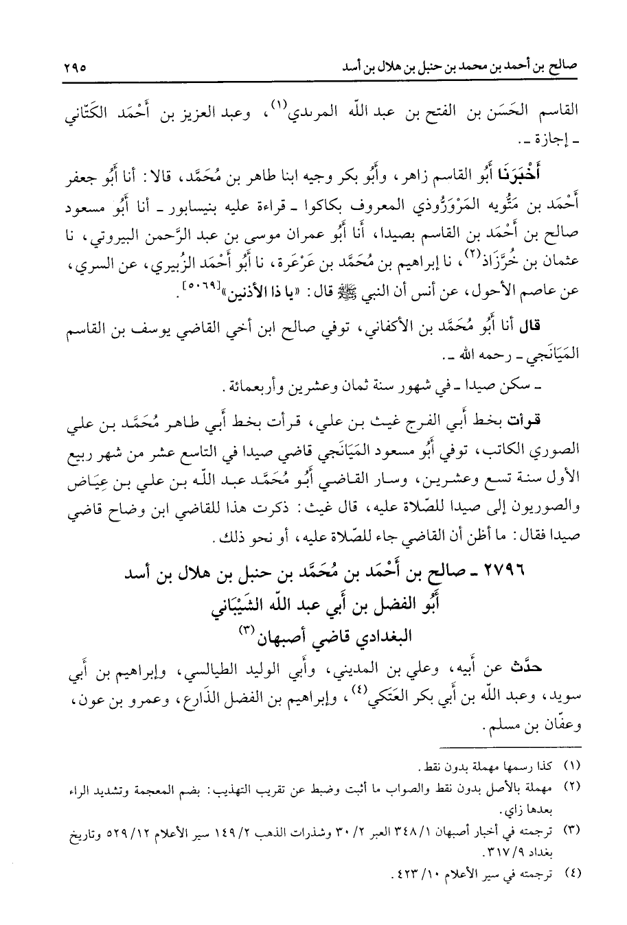 2796 - صالح بن أحمد بن محمد بن حنبل بن هلال بن أسد أبو الفضل بن أبي عبد الله الشيباني البغدادي قاضي أصبهان (3) حدث عن أبيه وعلي بن المديني وأبي الوليد الطيالسي وإبراهيم بنأبي سويد وعبد الله بن أبي بكر العتكي (4) وإبراهيم بن الفضل الذارع وعمرو بن عون وعفان بن مسلم