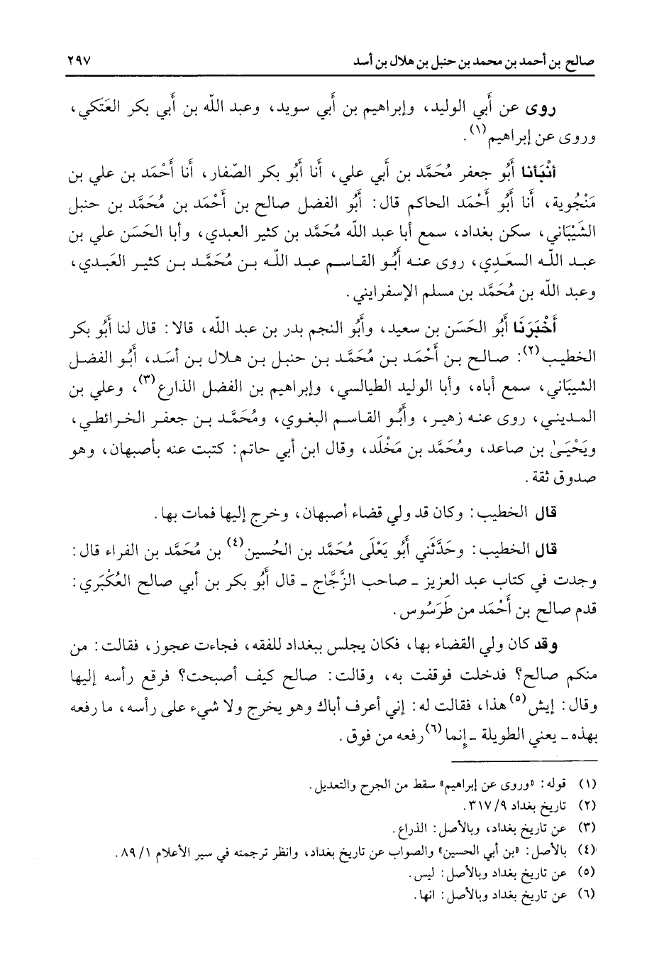 روى عن أبي الوليد وإبراهيم بن أبي سويد وعبد الله بنأبي بكر العتكي وروى عن إبراهيم (1) أنبأنا أبو جعفر محمد بن أبي علي أنا أبو بكر الصفار أنا أحمد بن علي بن منجوية أنا أبو أحمد الحاكم قال أبو الفضل صالح بنأحمد بن محمد بن حنبل الشيباني سكن بغداد سمع أبا عبد الله محمد بن كثير العبدي وأبا الحسن علي بن عبد الله السعدي روى عنه أبو القاسم عبد الله بن محمد بن كثير العبدي وعبد الله بن محمد بن مسلم الإسفرايني أخبرنا أبو الحسن بن سعيد وأبو النجم بدر بن عبد الله قالا قال لنا أبو بكر الخطيب (2) صالح بن أحمد بن محمد بن حنبل بن هلال بن أسد أبو الفضل الشيباني سمع أباه وأبا الوليد الطيالسي وإبراهيم بن الفضل الذارع (3) وعلي بن المديني روى عنه زهير وأبو القاسم البغوي ومحمد بن جعفر الخرائطي ويحيى بن صاعد ومحمد بن مخلد وقال ابن أبي حاتم كتبت عنه بأصبهان وهو صدوق ثقة قال الخطيب وكان قد ولي قضاء أصبهان وخرج إليها فمات بها قال الخطيب وحدثني أبو يعلى محمد بن الحسين (4) بن محمد بن الفراء قال وجدت في كتاب عبد العزيز صاحب الزجاج قال أبو بكر بن أبي صالح العكبري قدم صالح بن أحمد بن طرسوس وقد كان ولي القضاء بها فكان يجلس ببغداد للفقه فجاءت عجوز فقالت من منكم صالح فدخلت فوقفت به وقالت صالح كيف أصبحت فرفع رأسه إليها وقال إيش (5) هذا فقالت له إني أعرف أباك وهو يخرج ولا شئ على رأسه ما رفعه بهذه يعني الطويلة إنما (6) رفعه من فوق