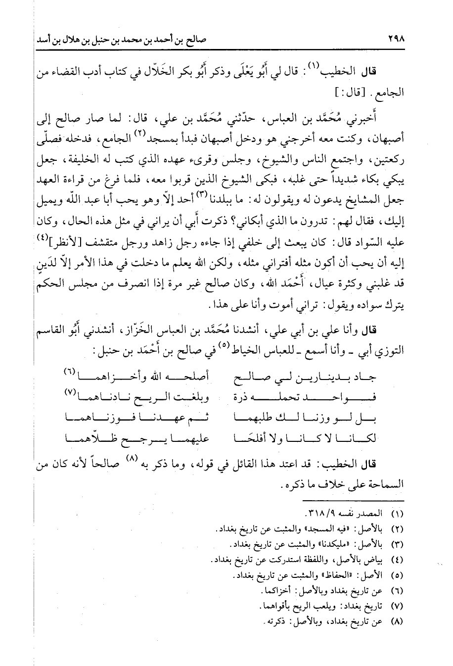قال الخطيب (1) قال لي أبو يعلى وذكر أبو بكر الخلال في كتاب أدب القضاء من الجامع قال أخبرني محمد بن العباس حدثني محمد بن علي قال لما صار صالح إلى أصبهان وكنت معه أخرجني هو ودخل أصبهان فبدأ بمسجد (2) الجامع فدخله فصلى ركعتين واجتمع الناس والشيوخ وجلس وقرئ عهده الذي كتب له الخليفة جعل يبكي بكاء شديدا حتى غلبه فبكى الشيوخ الذين قربوا معه فلما فرغ من قراءة العهد جعل المشايخ يدعون له ويقولون له ما ببلدنا (3) أحد إلا وهو يحب أبا عبد الله ويميل إليك فقال لهم تدرون ما الذي أبكاني ذكرت أبي أن يراني في مثل هذه الحال وكان عليه السواد قال كان يبعث إلى خلفي إذا جاءه رجل زاهد ورجل متقشف لأنظر (4) إليه أن يحب أن أكون مثله أفتراني مثله ولكن الله يعلم ما دخلت في هذا الأمر إلا لدين قد غلبني وكثرة عيال أحمد الله وكان صالح غير مرة إذا انصرف من مجلس الحكم يترك سواده ويقول تراني أموت وأنا على هذا قال وأنا علي بن أبي علي أنشدنا محمد بن العباس الخزاز أنشدني أبو القاسم التوزي أبي وأنا أسمع للعباس الخياط (5) في صالح بن أحمد بن حنبل * جاد بدينارين لي صالح * أصلحه الله وأخزاهما (6) فواحد تحمله ذرة * وبلغت الريح نادناهما (7) بل لو وزنا لك طلبهما * ثم عهدنا فوزناهما لكانا لا كانا ولا أفلحا * عليهما يرجح ظلاهما * قال الخطيب قد اعتد هذا القائل في قوله وما ذكر به (8) صالحا لأنه كان من السماحة على خلاف ما ذكره