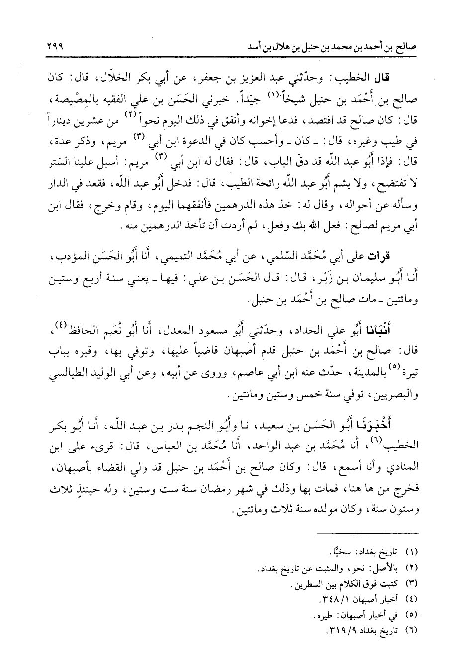 قال الخطيب وحدثني عبد العزيز بن جعفر عن أبي بكر الخلال قال كان صالح بن أحمد بن حنبل شيخا (1) جيدا خبرني الحسن بن علي الفقيه بالمصيصة قال كان صالح قد افتصد فدعا إخوانه وأنفق في ذلك اليوم نحوا (2) من عشرين دينارا في طيب وغيره قال كان وأحسب كان في الدعوة ابن أبي (3) مريم وذكر عدة قال فإذا أبو عبد الله قد دق الباب قال فقال له ابن أبي (3) مريم أسبل علينا الستر لا تفتضح ولا يشم أبو عبد الله رائحة الطيب قال فدخل أبو عبد الله فقعد في الدار وسأله عن أحواله وقال له خذ هذه الدرهمين فأنفقهما اليوم وقام وخرج فقال ابن أبي مريم لصالح فعل الله بك وفعل لم أردت أن تأخذ الدرهمين منه قرأت على أبي محمد السلمي عن أبي محمد التميمي أنا أبو الحسن المؤدب أنا أبو سليمان بن زبر قال قال الحسن بن علي فيها يعني سنة أربع وستين ومائتين مات صالح بن أحمد بن حنبل أنبأنا أبو علي الحداد وحدثني أبو مسعود المعدل أنا أبو نعيم الحافظ (4) قال صالح بن أحمد بن حنبل قدم أصبهان قاضيا عليها وتوفي بها وقبره بباب تيرة (5) بالمدينة حدث عنه ابن أبي عاصم وروى عن أبيه وعن أبي الوليد الطيالسي والبصريين توفي سنة خمس وستين ومائتين أخبرنا أبو الحسن بن سعيد نا وأبو النجم بدر بن عبد الله أنا أبو بكر الخطيب (6) أنا محمد بن عبد الواحد أنا محمد بن العباس قال قرئ على ابن المنادي وأنا أسمع قال وكان صالح بنأحمد بن حنبل قد ولي القضاء بأصبهان فخرج من ها هنا فمات بها وذلك في شهر رمضان سنة ست وستين وله حينئذ ثلاث وستون سنة وكان مولده سنة ثلاث ومائتين