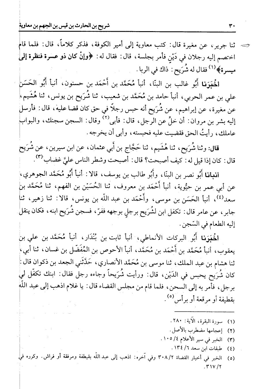 ثنا جرير عن مغيرة قال كتب معاوية إلى أمير الكوفة فذكر كلاما قال فلما قام اختصم إليه رجلان في دين فأمر بجلسة قال فقال له " وإن كان ذو عسرة فنظرة إلى ميسرة " (1) فقال له شريح ذاك في الربا أخبرنا أبو غالب بن البنا أنبأ محمد بن أحمد بن حسنون أنبأ أبو الحسن علي بن عمر الحربي أنبأحامد بن محمد بن شعيب ثنا شريح بن يونس ثنا هشيم عن مغيرة عن إبراهيم عن شريح أنه حبس رجلا في حق كان قضا عليه قال فأرسل إليه بشر بن مروان أن خل عن الرجل قال فأبى (2) وقال السجن سجنك والبواب عاملك رأيت الحق فقضيت عليه فحبسته وأبى أن يخرجه قال وثنا شريح ثنا هشيم ثنا حجاج بن أبي عثمان عن ابن سيرين عن شريح قال كان إذا قيل له كيف أصبحت قال أصبحت وشطر الناس علي غضاب (3) أنبأنا أبو نصر بن البنا وأبو طالب بن يوسف قالا أنبأ أبو محمد الجوهري عن أبي عمر بن حيوية أنبأ أحمد بن معروف ثنا الحسين بن الفهم ثنا محمد بن سعد (4) أنبأ الحسن بن موسى وأحمد بن عبد الله بن يونس قالا ثنا زهير ثنا جابر عن عامر قال تكفل ابن لشريح برجل بوجهه ففر فسجن شريح بنه فكان ينقل إليه الطعام في السجن أخبرنا أبو البركات الأنماطي أنبأ ثابت بن بندار أنبأ محمد بن علي بن يعقوب أنبأ محمد بن أحمد بن محمد أنبأ الأحوص بن المفضل بن غسان ثنا أبي ثنا هشام بن عبد الملك ثنا موسى بن محمد الأنصاري حدثني الجعد بن ذكوان قال كان شريح يحبس في الدين قال ورأيت شريحا وجاءه رجل فقال ابنك تكفل لي برجل فأمر به إلى السجن فلما قام من مجلس القضاء قال يا غلام اذهب إلى عبد الله بقطيفة أو مرقعة أو برأس (5)
