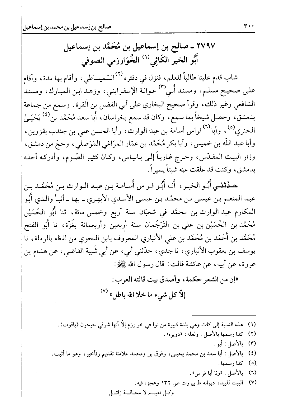 2797 - صالح بن إسماعيل بن محمد بن إسماعيل أبو الخير الكاثي (1) الخوارزمي الصوفي شاب قدم علينا طالبا للعلم فنزل في دفتره (2) السميساطي وأقام بها مدة وأقام على صحيح مسلم ومسند أبي (3) عوانة الإسفرايني وزهد ابن المبارك ومسند الشافعي وغير ذلك وقرأ صحيح البخاري على أبي الفضل بن القرة وسمع من جماعة بدمشق وحصل شيخا بما سمع وكان قد سمع بخراسان أبا سعد محمد بن (4) يحيى الحنري (5) وأبا (6) فراس أسامة بن عبد الوارث وأبا الحسن علي بن جندب بقزوين وأبا عبد الله بن خميس وأبا بكر محمد بن عمار المراغي الموصلي وحج من دمشق وزار البيت المقدس وخرج غازيا إلى بانياس وكان كثير الصوم وأدركه أجله بدمشق وكنت قد علقت عنه شيئا يسيرا حدثني أبو الخير أنا أبو فراس أسامة بن عبد الوارث بن محمد بن عبد المنعم بن عيسى بن محمد بن عيسى الأسدي الأبهري بها أنبأ والدي أبو المكارم عبد الوارث بن محمد في شعبان سنة أربع وخمس مائة ثنا أبو الحسين محمد بن الحسين بن علي بن الترجمان سنة أربعين وأربعمائة بغزة نا أبو الفتح محمد بن أحمد بن محمد بن علي الأنباري المعروف بابن النحوي من لفظه بالرملة نا يوسف بن يعقوب الأنباري نا جدي حدثني أبي عن أبي شيبة القاضي عن هشام بن عروة عن أبيه عن عائشة قالت قال رسول الله (صلى الله عليه وسلم) إن من الشعر حكمة وأصدق بيت قالته العرب * ألا كل شئ ما خلا لله باطل (7)