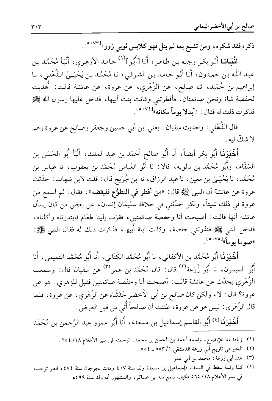 ذكره فقد شكره ومن تشبع بما لم ينل فهو كلابس ثوبي زور أنبأنا أبو بكر وجيه بن طاهر أنا أبو (1) حامد الأزهري أنبأ محمد بن عبد الله بن حمدون أنا أبو حامد بن الشرقي نا محمد بن يحيى الذهلي نا إبراهيم بن حميد ثنا صالح عن الزهري عن عروة عن عائشة قالت أهديت لحفصة شاة ونحن صائمتان فأفطرتني وكانت بنت أبيها فدخل عليها رسول الله (صلى الله عليه وسلم) فذكرت ذلك له فقال أبدلا يوما مكانه قال الذهلي وحديث سفيان يعني ابن أبي حسين وجعفر وصالح عن عروة وهم لا شك فيه أخبرنا أبو بكر أيضا أنا أبو صالح أحمد بن عبد الملك أنبأ أبو الحسن بن السقاء وأبو محمد بن بالويه قالا نا أبو العباس محمد بن يعقوب نا عباس بن محمد نا يحيى بن معين نا عبد الرزاق نا ابن جريج قال قلت لابن شهاب حدثك عروة عن عائشة أن النبي (صلى الله عليه وسلم) قال من أفطر في التطوع فليقضه فقال لم أسمع من عروة في ذلك شيئا ولكن حدثني في خلافة سليمان إنسان عن بعض من كان يسأل عائشة أنها قالت أصبحت أنا وحفصة صائمين فقرب إلينا طعام فابتدرتاه وأكلتاه فدخل النبي (صلى الله عليه وسلم) فنذرتني حفصة وكانت ابنة أبيها فذكرت ذلك له فقال النبي (صلى الله عليه وسلم) صوما يوما أخبرنا أبو محمد بن الأكفاني نا أبو محمد الكتاني أنا أبو محمد التميمي أنا أبو الميمون نا أبو زرعة (2) قال قال محمد بن عمر (3) عن سفيان قالت وسمعت الزهري يحدث عن عائشة قالت أصبحت أنا وحفصة صائمتين فقيل للزهري هو عن عروة قال لا ولكن كان صالح بنأبي الأخضر حدثناه عن الزهري عن عروة فلما قال الزهري ليس هو عن عروة ظننت أن صالحا أتي من قبل العرض أخبرنا (4) أبو القاسم إسماعيل بن مسعدة أنا أبو عمرو عبد الرحمن بن محمد