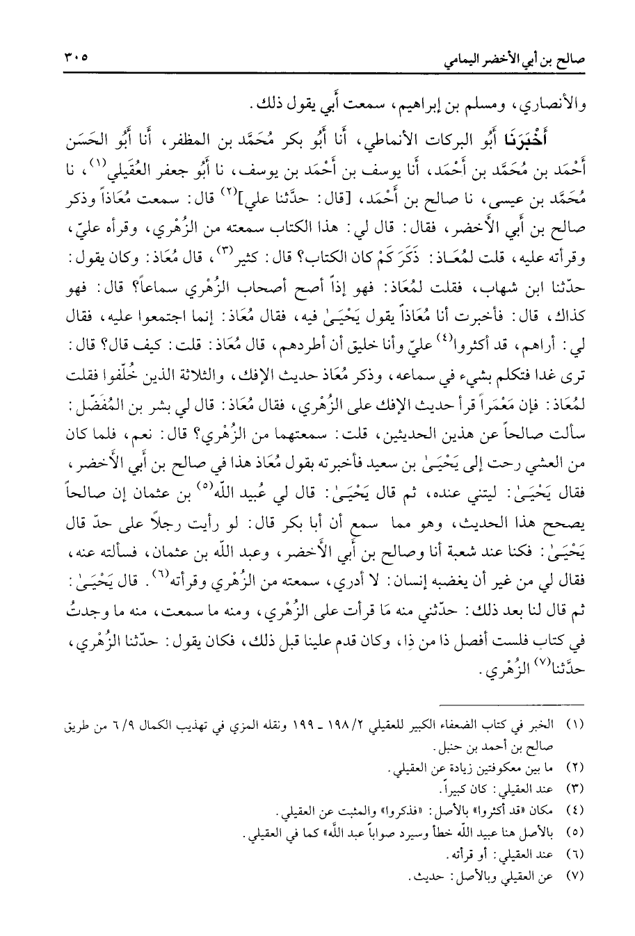 والأنصاري ومسلم بن إبراهيم سمعت أبي يقول ذلك أخبرنا أبو البركات الأنماطي أنا أبو بكر محمد بن المظفر أنا أبو الحسن أحمد بن محمد بن أحمد أنا يوسف بن أحمد بن يوسف نا أبو جعفر العقيلي (1) نا محمد بن عيسى نا صالح بن أحمد قال حدثنا علي (2) قال سمعت معاذا وذكر صالح بن أبي الأخضر فقال قال لي هذا الكتاب سمعته من الزهري وقرأه علي وقرأته عليه قلت لمعاذ ذكر كم كان الكتاب قال كثير (3) قال معاذ وكان يقول حدثنا ابن شهاب فقلت لمعاذ فهو إذا أصح أصحاب الزهري سماعا قال فهو كذاك قال فأخبرت أنا معاذا يقول يحيى فيه فقال معاذ إنما اجتمعوا عليه فقال لي أراهم قد أكثروا (4) علي وأنا خليق أن أطردهم قال معاذ قلت كيف قال قال ترى غدا فتكلم في سماعه وذكر معاذ حديث الإفك والثلاثة الذين خلفوا فقلت لمعاذ فإن معمرا قرأحديث الإفك على الزهري فقال معاذ قال لي بشر بن المفضل سألت صالحا عن هذين الحديثين قلت سمعتهما من الزهري قال نعم فلما كان من العشي رحت إلى يحيى بن سعيد فأخبرته بقول معاذ هذا في صالح بن أبي الأخضر فقال يحيى ليتني عنده ثم قال يحيى قال لي عبيد الله بن (5) عثمان إن صالحا يصحح هذا الحديث وهو مما سمع أن أبا بكر قال لو رأيت رجلا على حد قال يحيى فكنا عند شعبة أنا وصالح بنأبي الأخضر وعبد الله بن عثمان فسألته عنه فقال لي من غير أن يغضبه إنسان لا أدري سمعته من الزهري وقرأته (6) قال يحيى ثم قال لنا بعد ذلك حدثني منه ما قرأت على الزهري ومنه ما سمعت منه ما وجدت في كتاب فلست أفصل ذا من ذا وكان قدم علينا قبل ذلك فكان يقول حدثنا الزهري حدثنا (7) الزهري