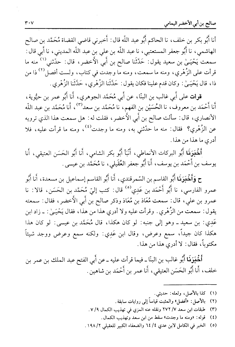 أنا أبو بكر بن خلف نا الحاكم أبو عبد الله قال أخبرني قاضي القضاة محمد بن صالح الهاشمي نا أبو جعفر المستعتبي نا عبد الله بن علي بن عبد الله المديني نا أبي قال سمعت يحيى بن سعيد يقول حدثنا صالح بن أبي الأخضر قال حدثني (1) منه ما قرأت على الزهري ومنه ما سمعت ومنه ما وجدت في كتاب ولست أفصل (2) ذا من ذا قال يحيى وكان قدم علينا فكان يقول حدثنا الزهري حدثنا الزهري قرأت على أبي غالب بن البنا عن أبي محمد الجوهري أنا أبو عمر بن حيوية أنا أحمد بن معروف نا الحسين بن الفهم نا محمد بن سعد (3) أنا محمد بن عبد الله الأنصاري قال سألت صالح بن أبي الأخضر فقلت له هل سمعت هذا الذي ترويه عن الزهري فقال منه ما حدثني به ومنه ما وجدت (4) ومنه ما قرأت عليه فلا أدري ما هذا من هذا أخبرنا أبو البركات الأنماطي أنبأ أبو بكر الشامي أنا أبو الحسن العتيقي أنا يوسف بن أحمد بن يوسف أنا أبو جعفر العقيلي نا محمد بن عيسى ح وأخبرنا أبو القاسم بن السمرقندي أنا أبو القاسم إسماعيل بن مسعدة أنا أبو عمرو الفارسي نا أبو أحمد بن عدي (5) قال كتب إلي محمد بن الحسن قالا نا عمرو بن علي قال سمعت معاذ بن معاذ وذكر صالح بن أبي الأخضر فقال سمعته يقول سمعت من الزهري وقرأت عليه ولا أدري هذا من هذا فقال يحيى زاد ابن عدي بن سعيد وهو إلى جنبه لو كان هكذا قال محمد بن عيسى لو كان هذا هكذا جيدا وسمع وعرض وقال ابن عدي ولكنه سمع وعرض ووجد شيئا مكتوبا فقال لا أدري هذا من هذا أخبرنا أبو غالب بن البنا فيما قرأت عليه عن أبي الفتح عبد الملك بن عمر بن خلف أنا أبو الحسن العتيقي أنا عمر بن أحمد بن شاهين