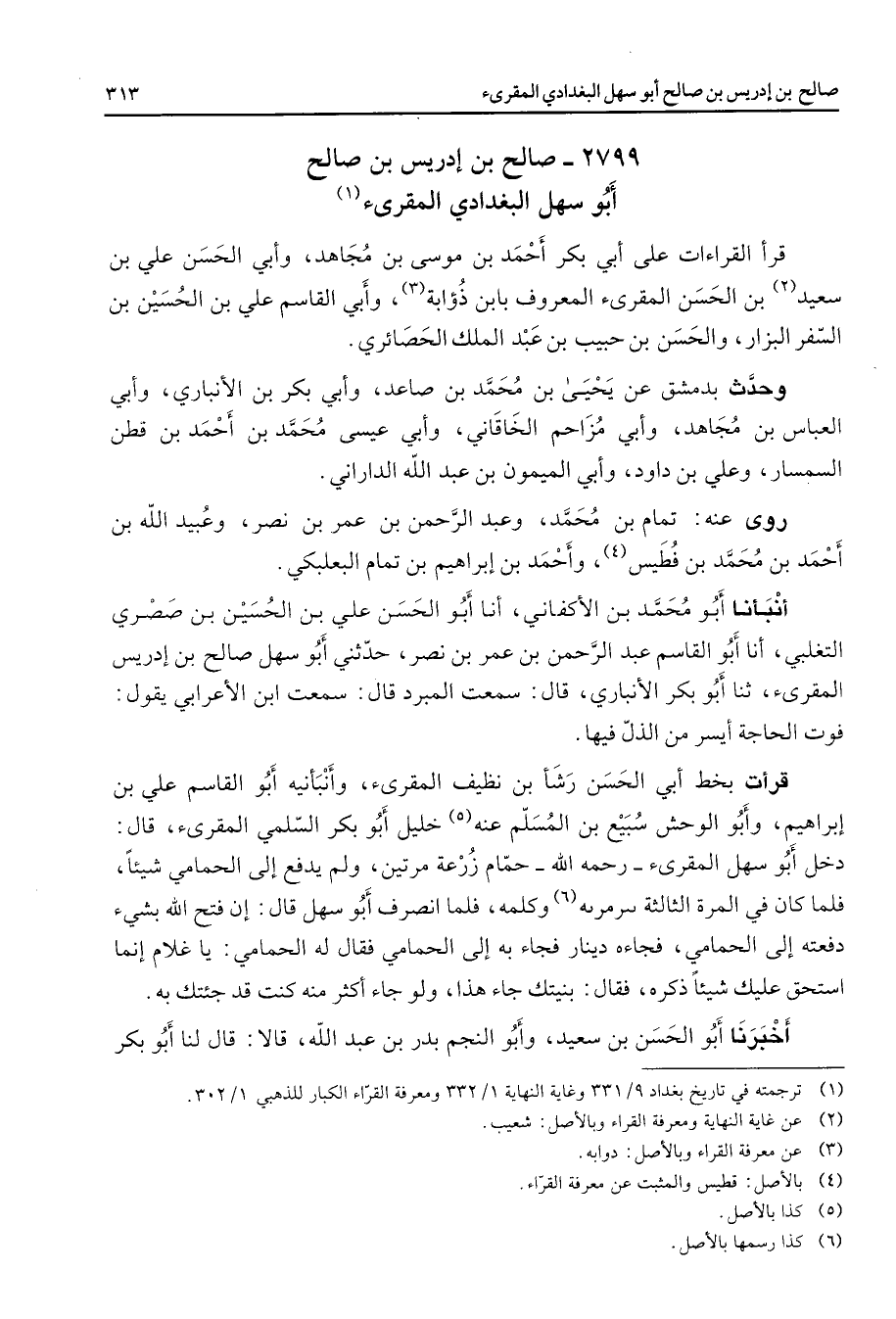 (1) ترجمته في تاريخ بغداد 9 / 331 وغاية النهاية 1 / 332 ومعرفة القراء الكبار للذهبي 1 / 302