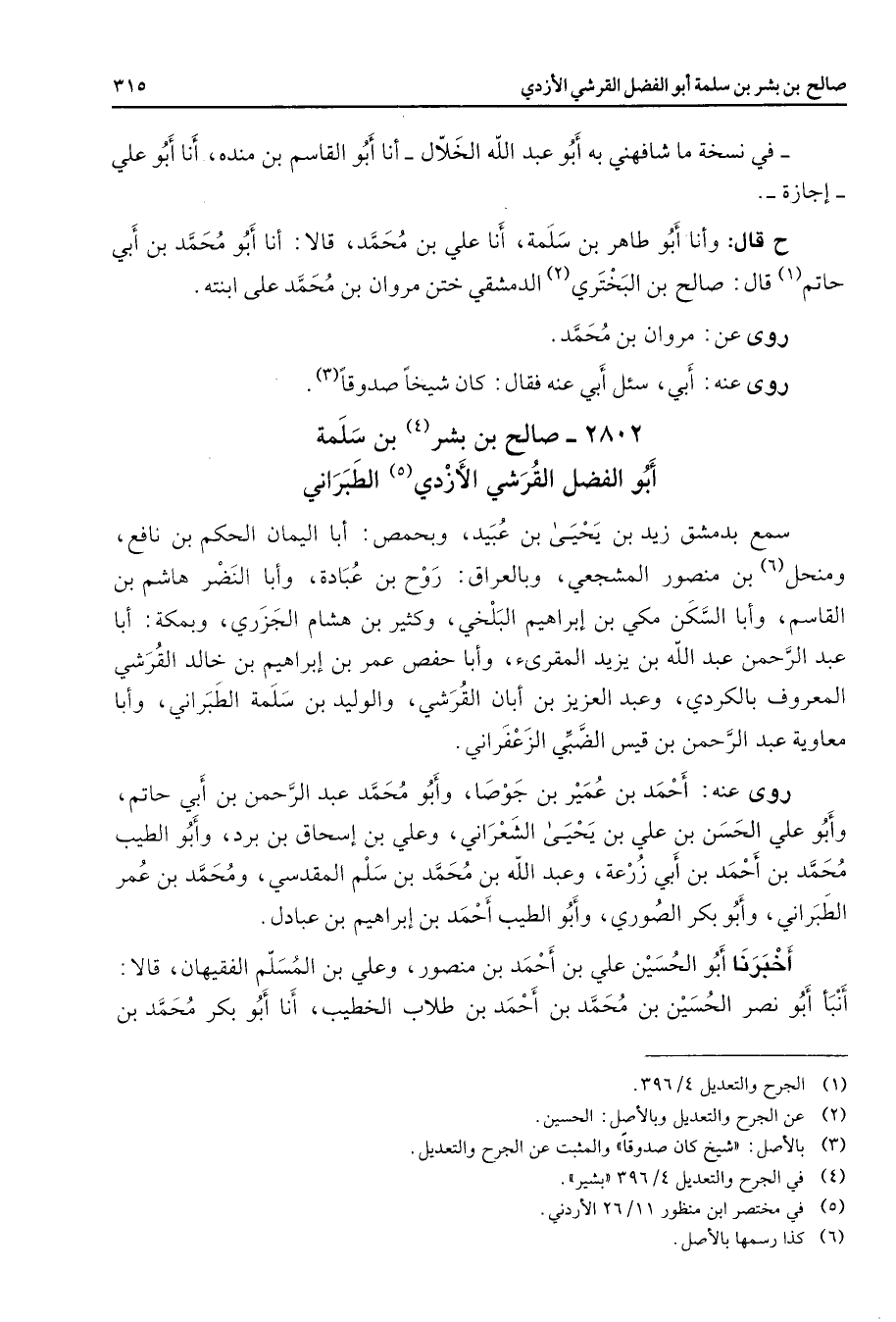 في نسخة ما شافهني به أبو عبد الله الخلال أنا أبو القاسم بن منده أنا أبو علي إجازة ح قال وأنا أبو طاهر بن سلمة أنا علي بن محمد قالا أنا أبو محمد بن أبي حاتم (1) قال صالح بن البختري (2) الدمشقي ختن مروان بن محمد على ابنته روى عن مروان بن محمد روى عنه أبي سئل أبي عنه فقال كان شيخا صدوقا (3)