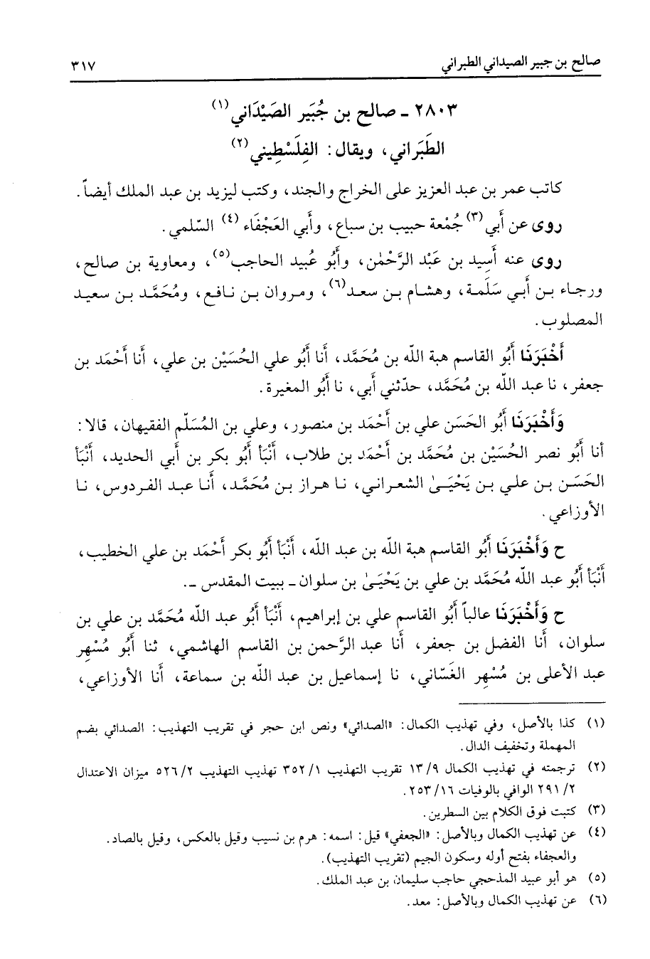 2803 - صالح بن جبير الصيداني (1) الطبراني ويقال الفلسطيني (2) كاتب عمر بن عبد العزيز على الخراج والجند وكتب ليزيد بن عبد الملك أيضا روى عن أبي (3) جمعة حبيب بن سباع وأبي العجفاء (4) السلمي روى عنه أسيد بن عبد الرحمن وأبو عبيد الحاجب (5) ومعاوية بن صالح ورجاء بن أبي سلمة وهشام بن سعد (6) ومروان بن نافع ومحمد بن سعيد المصلوب أخبرنا أبو القاسم هبة الله بن محمد أنا أبو علي الحسين بن علي أنا أحمد بن جعفر نا عبد الله بن محمد حدثني أبي نا أبو المغيرة وأخبرنا أبو الحسن علي بن أحمد بن منصور وعلي بن المسلم الفقيهان قالا أنا أبو نصر الحسين بن محمد بن أحمد بن طلاب أنبأ أبو بكر بنأبي الحديد أنبأ الحسن بن علي بن يحيى الشعراني نا هراز بن محمد أنا عبد الفردوس نا الأوزاعي ح وأخبرنا أبو القاسم هبة الله بن عبد الله أنبأ أبو بكر أحمد بن علي الخطيب أنبأ أبو عبد الله محمد بن علي بن يحيى بن سلوان ببيت المقدس ح وأخبرنا عالبا أبو القاسم علي بن إبراهيم أنبأ أبو عبد الله محمد بن علي بن سلوان أنا الفضل بن جعفر أنا عبد الرحمن بن القاسم الهاشمي ثنا أبو مسهر عبد الأعلى بن مسهر الغساني نا إسماعيل بن عبد الله بن سماعة أنا الأوزاعي