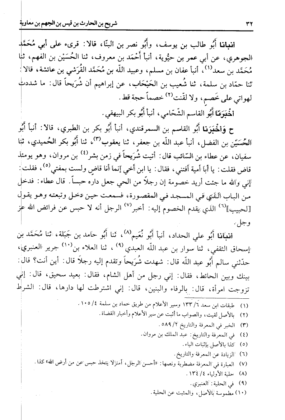 انبأنا أبو طالب بن يوسف وأبو نصر بن البنا قالا قرئ على أبي محمد الجوهري عن أبي عمر بن حيوية أنبأ أحمد بن معروف ثنا الحسين بن الفهم ثنا محمد بن سعد (1) أنبأ عفان بن مسلم وعبيد الله بن محمد القرشي بن عائشة قالا ثنا حماد بن سلمة ثنا شعيب بن الحبحاب عن إبراهيم أن شريحا قال ما شددت لهواتي على خصم ولا لقنت (2) خصما حجة قط أخبرنا أبو القاسم الشحامي أنبأ أبو بكر البيهقي ح وأخبرنا أبو القاسم بن السمرقندي أنبأ أبو بكر بن الطبري قالا أنبأ أبو الحسين بن الفضل أنبأ عبد الله بن جعفر ثنا يعقوب (3) ثنا أبو بكر الحميدي ثنا سفيان عن عطاء بن السائب قال أتيت شريحا في زمن (4) بشر بن مروان وهو يومئذ قاض فقلت يا أبا أمية أفتني فقال يا ابن أخي أنما أنا قاض ولست بمفتي (5) فقلت إني والله ما جئت أريد خصومة إن رجلا من الحي جعل داره حبسا قال عطاء فدخل من الباب الذي في المسجد في المقصورة فسمعت حين دخل وتبعته وهو يقول لحبيب (6) الذي يقدم الخصوم إليه أخبر (7) الرجل أنه لا حبس عن فرائض الله عز وجل أنبأنا أبو علي الحداد أنبأ أبو نعيم (8) ثنا أبو حامد بن جبلة ثنا محمد بن إسحاق الثقفي ثنا سوار بن عبد الله العبدي (9) ثنا العلاء بن (10) جرير العنبري حدثني سالم أبو عبد الله قال شهدت شريحا وتقدم إليه رجلا قال أين أنت قال بينك وبين الحائط فقال إني رجل من أهل الشام فقال بعيد سحيق قال إني تزوجت امرأة قال بالرفاء والبنين قال إني اشترطت لها دارها قال الشرط