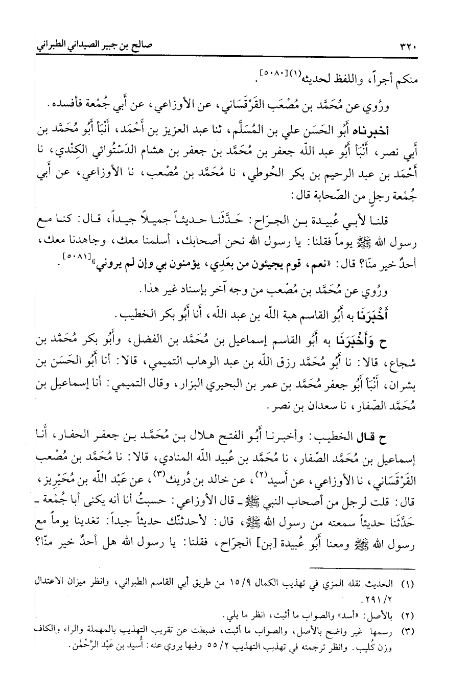 منكم أجرا واللفظ لحديثه (1) [* * *] وروي عن محمد بن مصعب القرقساني عن الأوزاعي عن أبي جمعة فأفسده أخبرناه أبو الحسن علي بن المسلم ثنا عبد العزيز بن أحمد أنبأ أبو محمد بن أبي نصر أنبأ أبو عبد الله جعفر بن محمد بن جعفر بن هشام الدستوائي الكندي نا أحمد بن عبد الرحيم بن بكر الحوطي نا محمد بن مصعب نا الأوزاعي عن أبي جمعة رجل من الصحابة قال قلنا لأبي عبيدة بن الجراح حدثنا حديثا جميلا جيدا قال كنا مع رسول الله (صلى الله عليه وسلم) يوما فقلنا يا رسول الله نحن أصحابك أسلمنا معك وجاهدنا معك أحد خير منا قال نعم قوم يجيئون من بعدي يؤمنون بي وإن لم يروني وروي عن محمد بن مصعب من وجه آخر بإسناد غير هذا أخبرنا به أبو القاسم هبة الله بن عبد الله أنا أبو بكر الخطيب ح وأخبرنا به أبو القاسم إسماعيل بن محمد بن الفضل وأبو بكر محمد بن شجاع قالا نا أبو محمد رزق الله بن عبد الوهاب التميمي أنا أبو الحسن بن بشران أنبأ أبو جعفر محمد بن عمر بن البحيري البزار وقال التميمي أنا إسماعيل بن محمد الصفار نا سعدان بن نصر ح قال الخطيب وأخبرنا أبو الفتح هلال بن محمد بن جعفر الحفار أنا إسماعيل بن محمد الصفار نا محمد بن عبيد الله المنادي قالا نا محمد بن مصعب القرقساني نا الأوزاعي عن أسيد (2) عن خالد بن دريك (3) عن عبد الله بن محيريز قال قلت لرجل من أصحاب النبي (صلى الله عليه وسلم) قال الأوزاعي حسبت أنا أنه يكنى أبا جمعة حدثنا حديثا سمعته من رسول الله (صلى الله عليه وسلم) قال لأحدثنك حديثا جيدا تغدينا يوما مع رسول الله (صلى الله عليه وسلم) ومعنا أبو عبيدة بن الجراح فقلنا يا رسول الله هل أحد خير منا