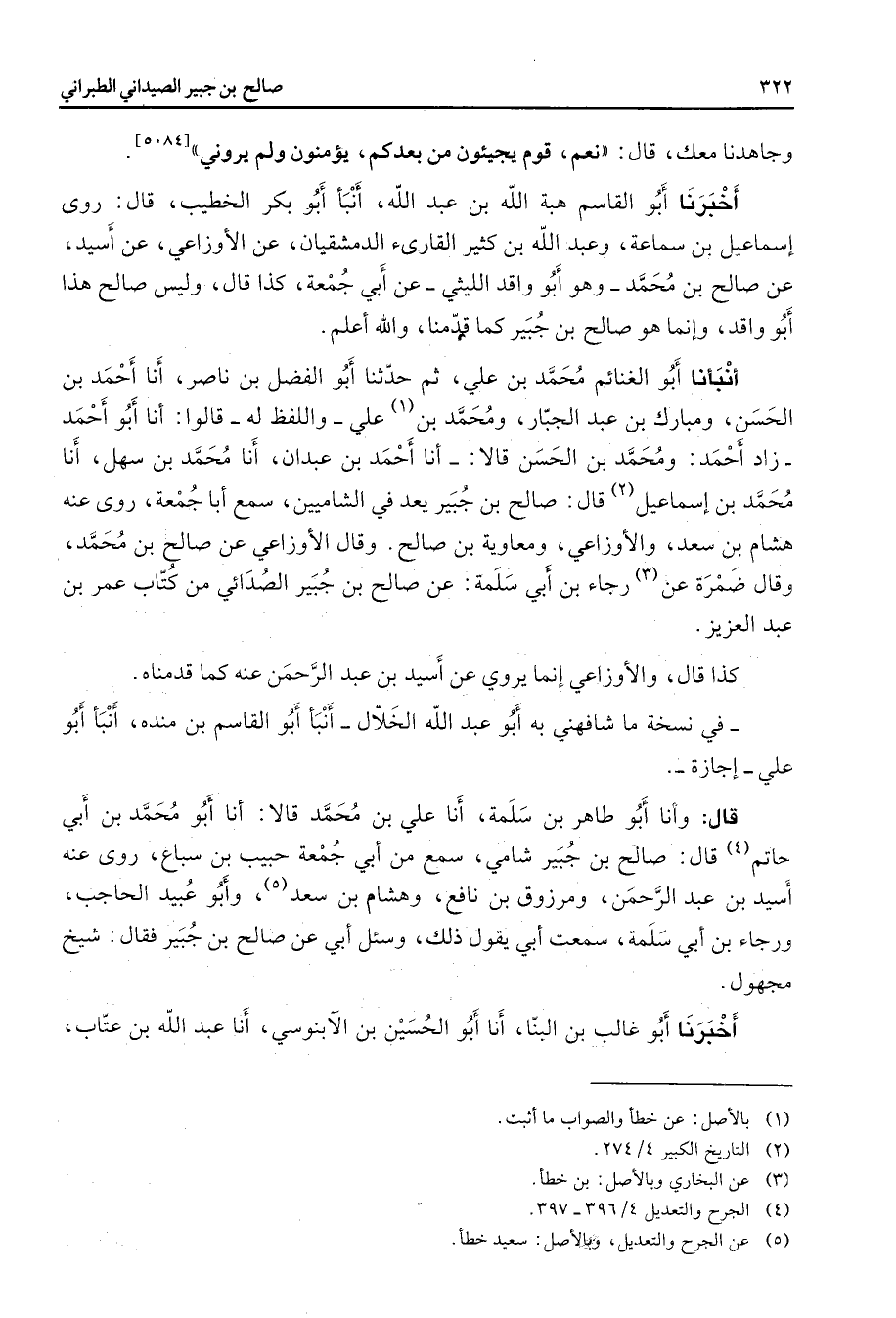 وجاهدنا معك قال نعم قوم يجيئون من بعدكم يؤمنون ولم يروني أخبرنا أبو القاسم هبة الله بن عبد الله أنبأ أبو بكر الخطيب قال روى إسماعيل بن سماعة وعبد الله بن كثير القارئ الدمشقيان عن الأوزاعي عن أسيد عن صالح بن محمد وهو أبو واقد الليثي عن أبي جمعة كذا قال وليس صالح هذا أبو واقد وإنما هو صالح بن جبير كما قدمنا والله أعلم أنبأنا أبو الغنائم محمد بن علي ثم حدثنا أبو الفضل بن ناصر أنا أحمد بن الحسن ومبارك بن عبد الجبار ومحمد بن (1) علي واللفظ له قالوا أنا أبو أحمد زاد أحمد ومحمد بن الحسن قالا أنا أحمد بن عبدان أنا محمد بن سهل أنا محمد بن إسماعيل (2) قال صالح بن جبير يعد في الشاميين سمع أبا جمعة روى عنه هشام بن سعد والأوزاعي ومعاوية بن صالح وقال الأوزاعي عن صالح بن محمد وقال ضمرة عن (3) رجاء بن أبي سلمة عن صالح بن جبير الصدائي من كتاب عمر بن عبد العزيز كذا قال والأوزاعي إنما يروي عن أسيد بن عبد الرحمن عنه كما قدمناه في نسخة ما شافهني به أبو عبد الله الخلال أنبأ أبو القاسم بن منده أنبأ أبو علي إجازة قال وأنا أبو طاهر بن سلمة أنا علي بن محمد قالا أنا أبو محمد بن أبي حاتم (4) قال صالح بن جبير شامي سمع من أبي جمعة حبيب بن سباع روى عنه أسيد بن عبد الرحمن ومرزوق بن نافع وهشام بن سعد (5) وأبو عبيد الحاجب ورجاء بن أبي سلمة سمعت أبي يقول ذلك وسئل أبي عن صالح بن جبير فقال شيخ مجهول أخبرنا أبو غالب بن البنا أنا أبو الحسين بن الآبنوسي أنا عبد الله بن عتاب