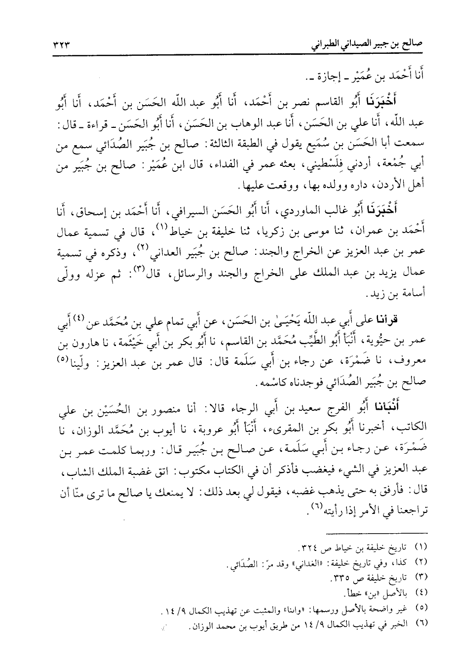 أنا أحمد بن عمير إجازة أخبرنا أبو القاسم نصر بن أحمد أنا أبو عبد الله الحسن بن أحمد أنا أبو عبد الله أنا علي بن الحسن أنا عبد الوهاب بن الحسن أنا أبو الحسن قراءة قال سمعت أبا الحسن بن سميع يقول في الطبقة الثالثة صالح بن جبير الصدائي سمع من أبي جمعة أردني فلسطيني بعثه عمر في الفداء قال ابن عمير صالح بن جبير من أهل الأردن داره وولده بها ووقعت عليها أخبرنا أبو غالب الماوردي أنا أبو الحسن السيرافي أنا أحمد بن إسحاق أنا أحمد بن عمران ثنا موسى بن زكريا ثنا خليفة بن خياط (1) قال في تسمية عمال عمر بن عبد العزيز عن الخراج والجند صالح بن جبير العداني (2) وذكره في تسمية عمال يزيد بن عبد الملك على الخراج والجند والرسائل قال (3) ثم عزله وولى أسامة بن زيد قرأنا على أبي عبد الله يحيى بن الحسن عن أبي تمام علي بن محمد عن (4) أبي عمر بن حيوية أنبأ أبو الطيب محمد بن القاسم نا أبو بكر بن أبي خيثمة نا هارون بن معروف نا ضمرة عن رجاء بن أبي سلمة قال قال عمر بن عبد العزيز ولينا (5) صالح بن جبير الصدائي فوجدناه كاسمه أنبأنا أبو الفرج سعيد بن أبي الرجاء قالا أنا منصور بن الحسين بن علي الكاتب أخبرنا أبو بكر بن المقرئ أنبأ أبو عروبة نا أيوب بن محمد الوازن نا ضمرة عن رجاء بن أبي سلمة عن صالح بن جبير قال وربما كلمت عمر بن عبد العزيز في الشئ فيغضب فأذكر أن في الكتاب مكتوب اتق غضبة الملك الشاب قال فأرفق به حتى يذهب غضبه فيقول لي بعد ذلك لا يمنعك يا صالح ما ترى منا أن تراجعنا في الأمر إذا رأيته (6)