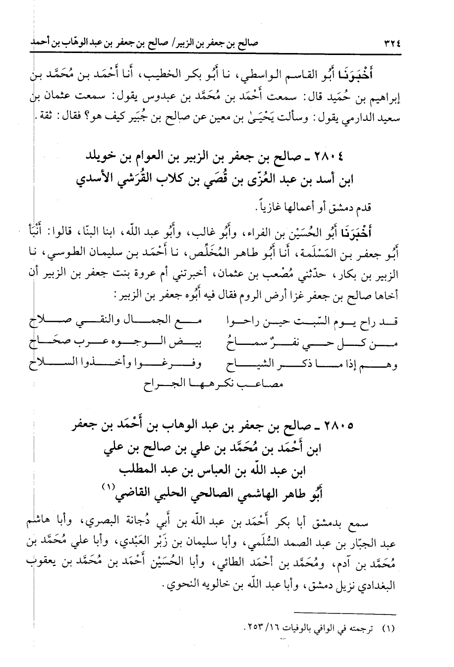 2804 - صالح بن جعفر بن الزبير بن العوام بن خويلد ابن أسد بن عبد العزى بن قصي بن كلاب القرشي الأسدي قدم دمشق أو أعمالها غازيا أخبرنا أبو الحسين بن الفراء وأبو غالب وأبو عبد الله ابنا البنا قالوا أنبأ أبو جعفر بن المسلمة أنا أبو طاهر المخلص نا أحمد بن سليمان الطوسي نا الزبير بن بكار حدثني مصعب بن عثمان أخبرتني أم عروة بنت جعفر بن الزبير أن أخاها صالح بن جعفر غزا أرض الروم فقال فيه أبوه جعفر بن الزبير * قد راح يوم السبت حين راحوا * مع الجمال والنقي صلاح من كل حي نفر سماح * بيض الوجوه عرب صحاح * وهم إذا ما ذكر الشياح * وفرغوا وأخذوا السلاح مصاعب نكرهها الجراح