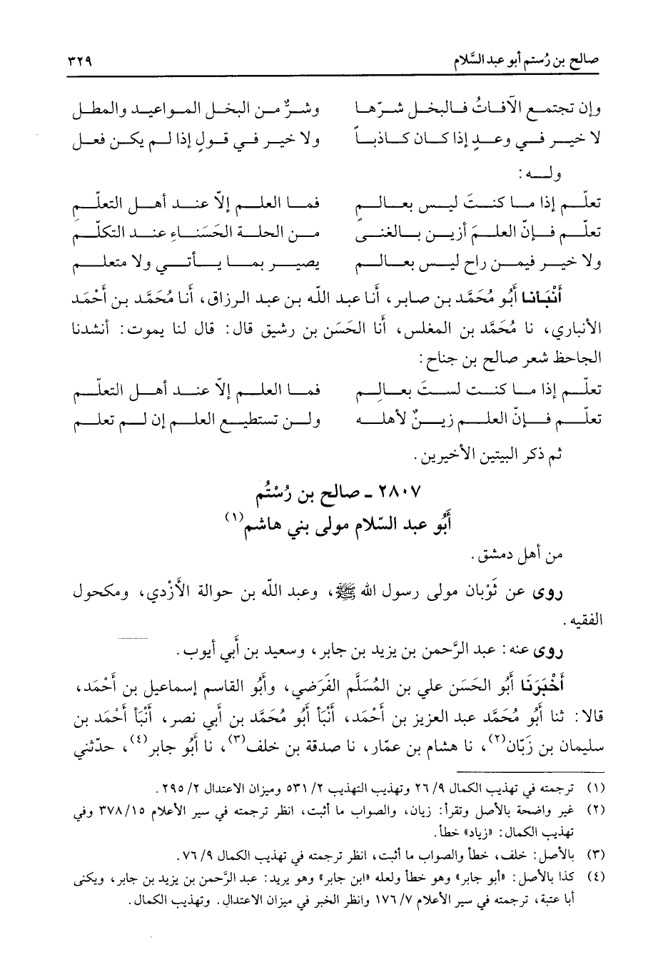 2807 - صالح بن رستم أبو عبد السلام مولى بني هاشم (1) من أهل دمشق روى عن ثوبان مولى رسول الله (صلى الله عليه وسلم) وعبد الله بن حوالة الأزدي ومكحول الفقيه روى عنه عبد الرحمن بن يزيد بن جابر وسعيد بن أبي أيوب أخبرنا أبو الحسن علي بن المسلم الفرضي وأبو القاسم إسماعيل بن أحمد قالا ثنا أبو محمد عبد العزيز بن أحمد أنبأ أبو محمد بن أبي نصر أنبأ أحمد بن سليمان بن زبان (2) نا هشام بن عمار نا صدقة بن خلف (3) نا أبو جابر (4) حدثني