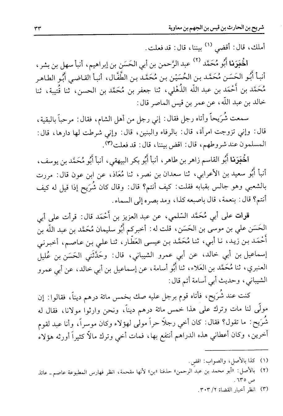أملك قال أقضي (1) بيننا قال قد فعلت أخبرنا أبو محمد (2) عبد الرحمن بنأبي الحسن بن إبراهيم أنبأسهل بن بشر أنبأ أبو الحسن محمد بن الحسين بن محمد بن الطفال أنبأ القاضي أبو الطاهر محمد بن أحمد بن عبد الله الذهلي ثنا جعفر بن محمد بن الحسن ثنا قتيبة ثنا خالد بن عبد الله عن عمر بن قيس الماصر قال سمعت شريحا وأتاه رجل فقال إني رجل من أهل الشام فقال مرحبا بالبقية قال وإني تزوجت امرأة قال بالرفاء والبنين قال وإني شرطت لها دارها قال المسلمون عند شروطهم قال اقض بيننا قال قد فعلت (3) أخبرنا أبو القاسم زاهر بن طاهر أنبأ أبو بكر البيهقي أنبأ أبو محمد بن يوسف أنبأ أبو سعيد بن الأعرابي ثنا سعدان بن نصر ثنا معاذ عن ابن عون قال مررت بالشعبي وهو جالس بقبابه فقلت كيف أنتم قال وقال كان شريح إذا قيل له كيف أنتم قال بنعمة قال باصبعه كذا ومد بصره إلى السماء قرأت على أبي محمد السلمي عن عبد العزيز بن أحمد قال قرأت على أبي الحسن علي بن موسى بن الحسن قلت له أخبركم أبو سليمان محمد بن عبد الله بن أحمد بن زيد نا أبي ثنا محمد بن عيسى العطار ثنا علي بن عاصم أخبرني إسماعيل بنأبي خالد عن أبي عمرو الشيباني قال وحدثني الحسن بن عليل العنبري ثنا محمد بن العلاء ثنا أبو أسامة عن إسماعيل بن أبي خالد عنأبي عمرو الشيباني وحديث أبي أسامة أتم قال كنت عند شريح فأتاه قوم برجل عليه صك بخمس مائة درهم دينا فقالوا إن مولى لنا مات وترك على هذا خمس مائة درهم دينا ونحن وارثوا مولانا فقال له شريح ما تقول فقال كان أخي رجلا حرا مولى لهؤلاء وكان موسرا وأنا عبد لقوم أخرين وكان أعطاني هذه الدراهم أنتفع بها فمات أخي وترك مالا كثيرا أورثه هؤلاء