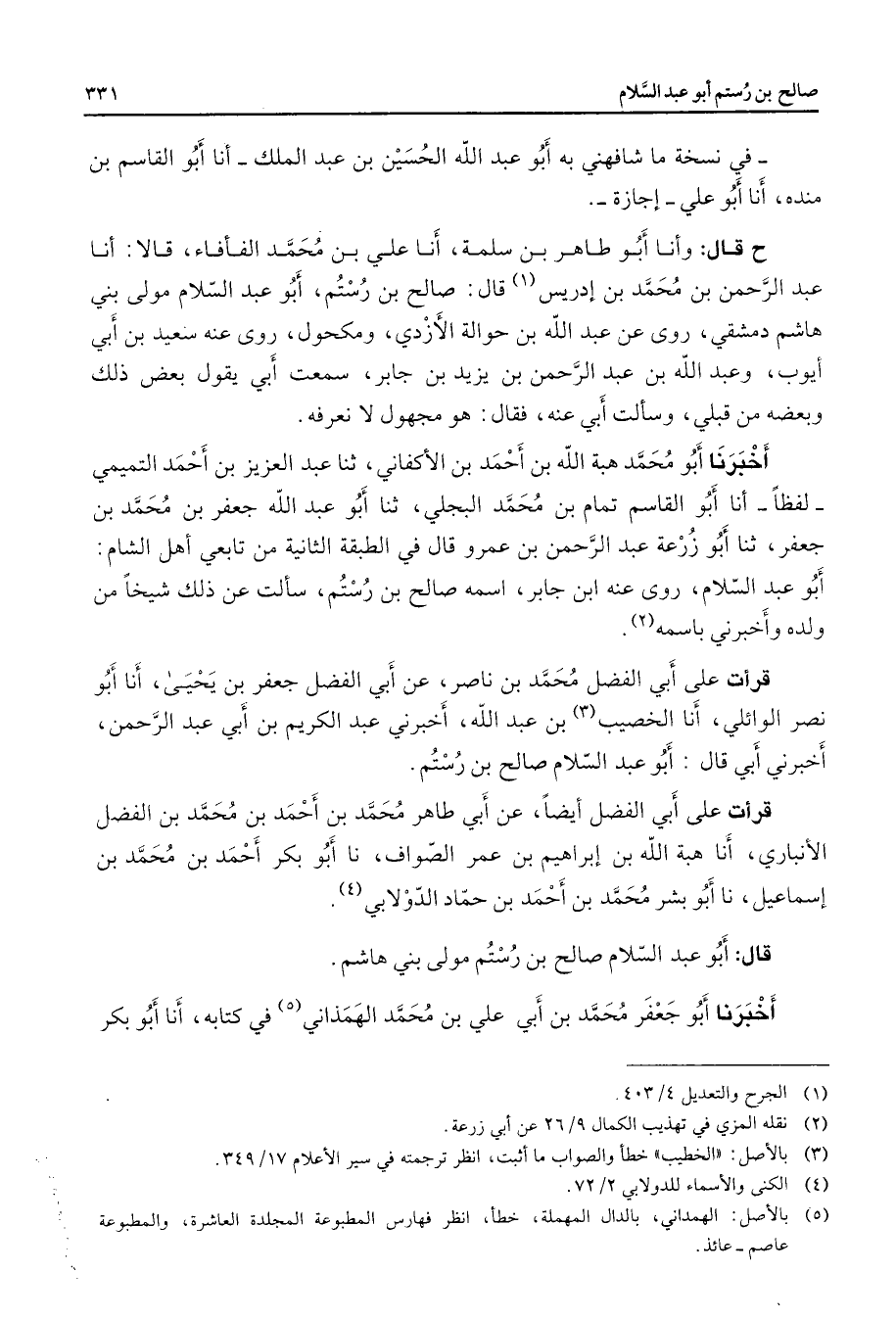 في نسخة ما شافهني به أبو عبد الله الحسين بن عبد الملك أنا أبو القاسم بن منده أنا أبو علي إجازة ح قال وأنا أبو طاهر بن سلمة أنا علي بن محمد الفأفاء قالا أنا عبد الرحمن بن محمد بن إدريس (1) قال صالح بن رستم أبو عبد السلام مولى بني هاشم دمشقي روى عن عبد الله بن حوالة الأزدي ومكحول روى عنه سعيد بن أبي أيوب وعبد الله بن عبد الرحمن بن يزيد بن جابر سمعت أبي يقول بعض ذلك وبعضه من قبلي وسألت أبي عنه فقال هو مجهول لا نعرفه أخبرنا أبو محمد هبة الله بن أحمد بن الأكفاني ثنا عبد العزيز بن أحمد التميمي لفظا أنا أبو القاسم تمام بن محمد البجلي ثنا أبو عبد الله جعفر بن محمد بن جعفر ثنا أبو زرعة عبد الرحمن بن عمرو قال في الطبقة الثانية من تابعي أهل الشام أبو عبد السلام روى عنه ابن جابر اسمه صالح بن رستم سألت عن ذلك شيخا من ولده وأخبرني باسمه (2) قرأت على أبي الفضل محمد بن ناصر عن أبي الفضل جعفر بن يحيى أنا أبو نصر الوائلي أنا الخصيب (3) بن عبد الله أخبرني عبد الكريم بن أبي عبد الرحمن أخبرني أبي قال أبو عبد السلام صالح بن رستم قرأت على أبي الفضل أيضا عن أبي طاهر محمد بن أحمد بن محمد بن الفضل الأنباري أنا هبة الله بن إبراهيم بن عمر الصواف نا أبو بكر أحمد بن محمد بن إسماعيل نا أبو بشر محمد بن أحمد بن حماد الدولابي (4) قال أبو عبد السلام صالح بن رستم مولى بني هاشم أخبرنا أبو جعفر محمد بن أبي علي بن محمد الهمذاني (5) في كتابه أنا أبو بكر