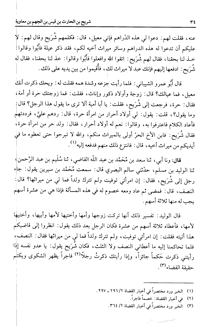 عنه فقلت لهم دعوا لي هذه الدراهم فإني معيل قال فكلمهم شريح وقال لهم لا عليكم أن تدعوا له هذه الدراهم وسائر ميراث أخيه لكم فقد ذكر عيلة فأبوا وقالوا خذ لنا بحقنا فقال لهم شريح اتقوا الله وافعلوا فأبوا وقالوا خذ لنا بحقنا فقال له شريح ادفعها إليهم فإنك عبد لا ميراث لك فأقيموا من بين يديه على ذلك قال أبو عمرو الشيباني فلما رأيت جزعه وشدة همه فقلت له ويحك ذكرت أنك معيل فما عيالك قال زوجة وأولاد ذكور وإناث فقلت فما زوجتك حرة أو أمة فقال حرة فرجعت إلى شريح فقلت يا أبا أمية ألا ترى ما يقول هذا الرجل قال وما يقول قلت يقول لي أولاد أحرار من امرأة حرة قال ردهم علي فرددتهم فأعاد الكلام فاعترفوا به وقالوا نعم له أولاد أحرار فقال ولد حر من امرأة حرة فقال شريح فابن الأخ الحر أولى بالميراث منكم والله لا تبرحوا حتى تعطوه ما في أيديكم من ميراث أخيه قال فانتزع ذلك منهم فدفعه إليه (1) قال ونا أبي ثنا سعد بن محمد بن عبد الله القاضي ثنا سليم بن عبد الرحمن ثنا الوليد بن مسلم حدثني سالم البصري قال سمعت محمد بن سيرين يقول جاء رجل إلى شريح فقال إن امرأتي توفيت ولم تترك ولدا فما لي من ميراثها قال النصف قال فمضى ثم عاد ومعه خصوم له في هذه المسألة فإذا هي من عشرة أسهم يجب له منها ثلاثة أسهم قال الوليد تفسير ذلك أنها تركت زوجها وأمها وأختيها لأمها وأبيها وأختيها لأمها فأعطاه ثلاثة أسهم من عشرة فكان الرجل بعد ذلك يقول انظروا إلى قاضيكم هذا أتيته فقلت إن امرأتي توفيت ولم تترك ولدا فما لي من ميراثها فقال النصف فلما تحاكمنا إليه ما أعطاني النصف ولا الثلث فكان شريح يقول يا عدو نفسه إذا رأيتني ذكرت حكما جائزا وإذا رأيتك ذكرت رجلا (2) فاجرا يظهر الشكوى ويكتم حقيقة القضاء (3)