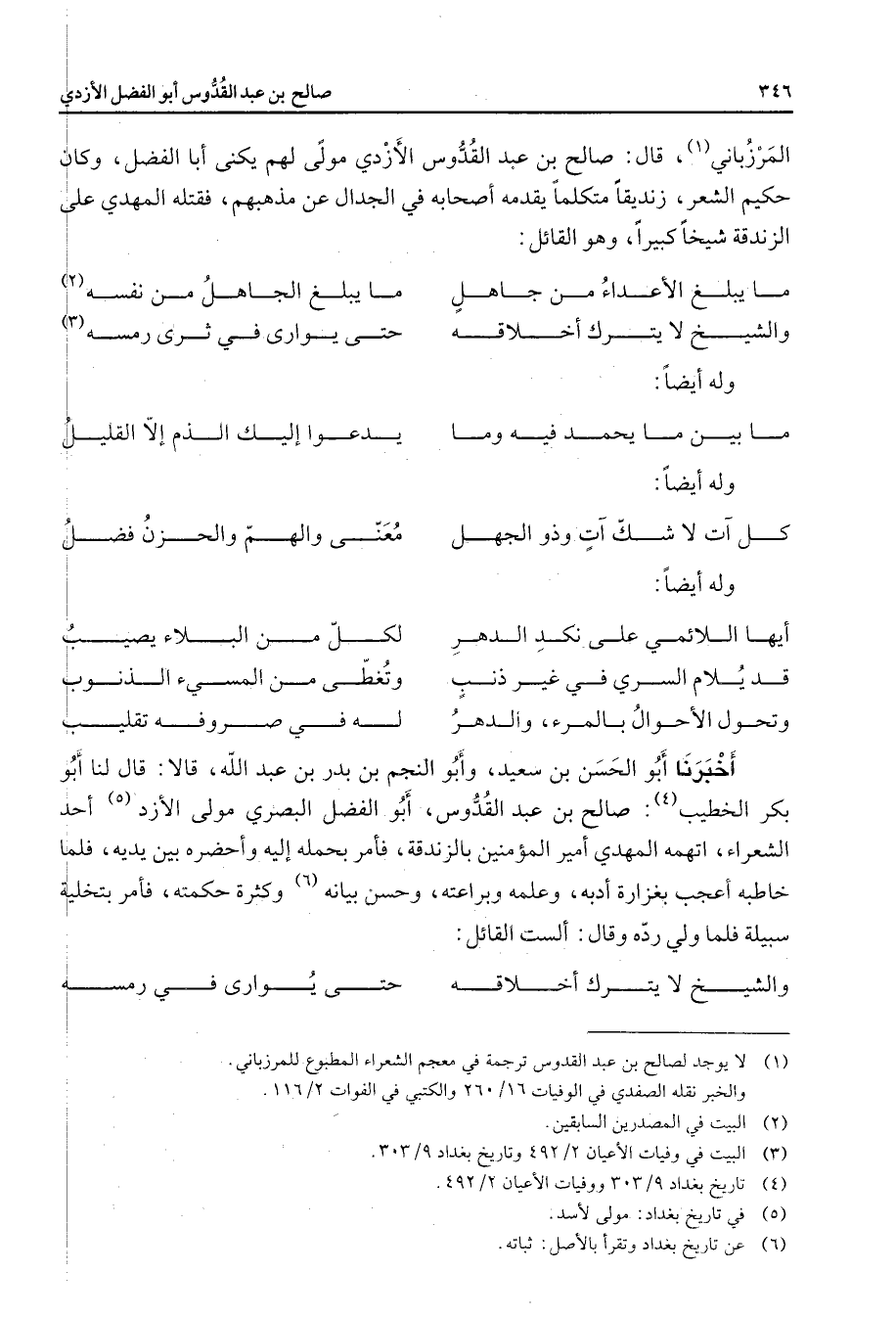 (1) لا يوجد لصالح بن عبد القدوس ترجمة في معجم الشعراء المطبوع للمرزباني