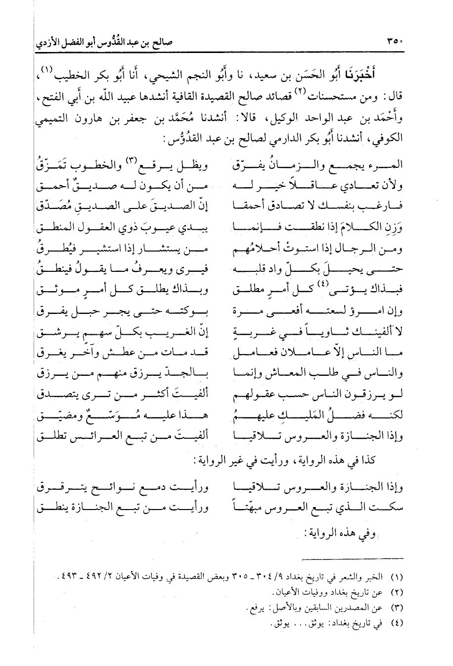 أخبرنا أبو الحسن بن سعيد نا وأبو النجم الشيحي أنا أبو بكر الخطيب (1) قال ومن مستحسنات (2) قصائد صالح القصيدة القافية أنشدها عبيد الله بن أبي الفتح وأحمد بن عبد الواحد الوكيل قالا أنشدنا محمد بن جعفر بن هارون التميمي الكوفي أنشدنا أبو بكر الدارمي لصالح بن عبد القدوس * المرء يجمع والزمان يفرق * ويظل يرقع (3) والخطوب تمزق ولأن تعادي عاقلا خير له * من أن يكون له صديق أحمق فارغب بنفسك لا تصادق أحمقا * إن الصديق على الصديق مصدق وزن الكلام إذا نطقت فإنما * يبدي عيوب ذوي العقول المنطق ومن الرجال إذا استوت أحلامهم * من يستشار إذا استشير فيطرق حتى يحيل بكل واد قلبه * فيرى ويعرف ما يقول فينطق فبذاك يؤتى (4) كل أمر مطلق * وبذاك يطلق كل أمر موثق وإن امرؤ لسعته أفعى مرة * بوكته حتى يجر حبل يفرق لا ألقينك ثاويا في غربة * إن الغريب بكل سهم يرشق ما الناس إلا عاملان فعامل * قد مات من عطش وآخر يغرق والناس في طلب المعاش وإنما * بالجد يرزق منهم من يرزق لو يرزقون الناس حسب عقولهم * ألفيت أكثر من ترى يتصدق * * لكنه فضل المليك عليهم * هذا عليه موسع ومضيق وإذا الجنازة والعروس تلاقيا * ألفيت من تبع العرائس تطلق كذا في هذه الرواية ورأيت في غير الرواية * وإذا الجنازة والعروس تلاقيا * ورأيت دمع نوائح يترقرق سكت الذي تبع العروس مبهتا * ورأيت من تبع الجنازة ينطق * وفي هذه الرواية