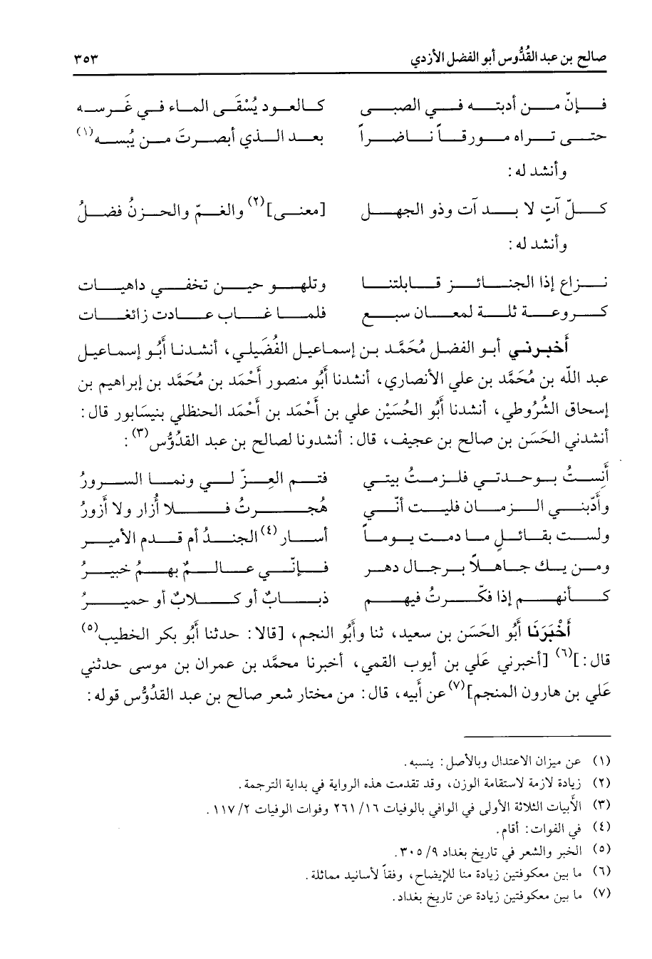 فإن من أدبته في الصبى * كالعود يسقى الماء في غرسه حتى تراه مورقا ناضرا * بعد الذي أبصرت من يبسه * (1) وأنشد له * كل آت لا بد وذو الجهل * معنى (2) والغم والحزن فضل * وأنشد له * نزاع إذا الجنائز قابلتنا * وتلهو حين تخفي داهيات كروعة ثلة لمعان سبع * فلما غاب عادت زائغات * أخبرني أبو الفضل محمد بن إسماعيل الفضيلي أنشدنا أبو إسماعيل عبد الله بن محمد بن علي الأنصاري أنشدنا أبو منصور أحمد بن محمد بن إبراهيم بن إسحاق الشروطي أنشدنا أبو الحسين علي بن أحمد بن أحمد الحنظلي بنيسابور قال أنشدني الحسن بن صالح بن عجيف قال أنشدونا لصالح بن عبد القدوس (3) * أنست بوحدتي فلزمت بيتي * فتم العز لي ونما السرور وأدبني الزمان فليت أني * هجرت فلا أزار ولا أزور ولست بقائل ما دمت يوما * أسار (4) الجند أم قدم الأمير ومن يك جاهلا برجال دهر * فإني عالم بهم خبير كأنهم إذا فكرت فيهم * ذباب أو كلاب أو حمير * أخبرنا أبو الحسن بن سعيد ثنا وأبو النجم قالا حدثنا أبو بكر الخطيب (5) قال (6) أخبرني علي بن أيوب القمي أخبرنا محمد بن عمران بن موسى حدثني علي بن هارون المنجم (7) عن أبيه قال من مختار شعر صالح بن عبد القدوس قوله