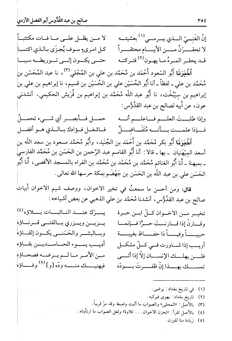 قد يحقر المرء ما يهون (2) فتركته * حتى يكون إلى توريطه سببا * أخبرنا أبو السعود أحمد بن محمد بن علي بن المجلي (3) نا عبد المحسن بن محمد بن علي لفظا أنا أبو الحسين علي بن الحسين بن قسيم نا إبراهيم بن علي بن إبراهيم بن سيبخت نا أبو عبد الله محمد بن إبراهيم بن قريش الحكيمي أنشدني عون عنأبيه لصالح بن عبد القدوس * وإذا طلبت العلم فاعلم أنه * حمل فأبصر أي شئ تحمل * * فإذا علمت بأنه متفاضل * فاشغل فؤادك بالذي هو أفضل * أخبرنا أبو بكر محمد بن أحمد بن الجنيد وأبو محمد مسعود بن سعد الله بن أسعد الميهنيان بها قالا أنا أبو القاسم عبد الرحمن بن الحسن بن محمد الفارسي بميهنة أنا أبو الغنائم محمد بن محمد بن محمد بن الفراء بالمسجد الأقصى أنا أبو الحسن علي بن عبد الله بن الحسن بن جهضم بمكة حرسها الله تعالى قال ومن أحسن ما سمعت في تخير الأخوان ووصف شيم الاخوان أبيات صالح بن عبد القدوس أنشدنا محمد بن علي الذهبي عن بعض أشياخه * تخير من الأخوان كل ابن حرة * يسرك عند النائبات بلاؤه (4) وقارن إذا قارنت حرا فإنما * يزين ويزري بالفتى قرناؤه حبيبا وفيا ذا حفاظ بغيبة * وبالبشر والحسنى يكون إلقاؤه أريب إذا شاورت في كل مشكل * أديب يسوء الحاسدين بقاؤه فلن يهلك الإنسان إلا إذا أتى * من الأمر ما لم يرضه فصحاؤه تمسك بهذا إن ظفرت بوده * فيهنيك منه وده و (5) وفاؤه