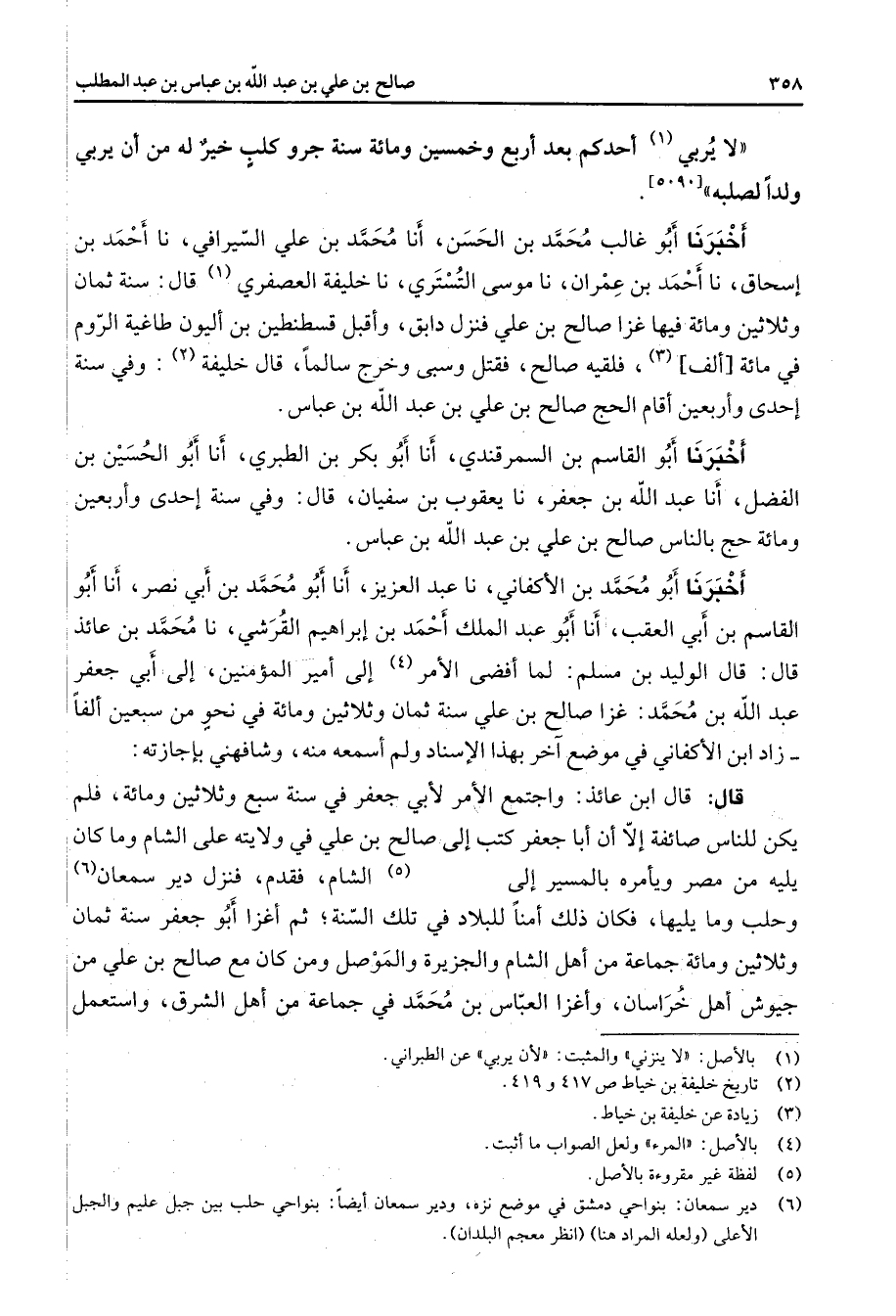 لا يربي (1) أحدكم بعد أربع وخمسين ومائة سنة جرو كلب خير له من أن يربي ولدا لصلبه أخبرنا أبو غالب محمد بن الحسن أنا محمد بن علي السيرافي نا أحمد بن إسحاق نا أحمد بن عمران نا موسى التستري نا خليفة العصفري (1) قال سنة ثمان وثلاثين ومائة فيها غزا صالح بن علي فنزل دابق وأقبل قسطنطين بن أليون طاغية الروم في مائة ألف (3) فلقيه صالح فقتل وسبى وخرج سالما قال خليفة (2) وفي سنة إحدى وأربعين أقام الحج صالح بن علي بن علي بن عبد الله بن عباس أخبرنا أبو القاسم بن السمرقندي أنا أبو بكر بن الطبري أنا أبو الحسين بن الفضل أنا عبد الله بن جعفر نا يعقوب بن سفيان قال وفي سنة إحدى وأربعين ومائة حج بالناس صالح بن علي بن عبد الله بن عباس أخبرنا أبو محمد بن الأكفاني نا عبد العزيز أنا أبو محمد بن أبي نصر أنا أبو القاسم بن أبي العقب أنا أبو عبد الملك بن إبراهيم القرشي نا محمد بن عائذ قال قال الوليد بن مسلم لما أفضى الأمر (4) إلى أمير المؤمنين إلى أبي جعفر عبد الله بن محمد غزا صالح بن علي سنة ثمان وثلاثين ومائة في نحو من سبعين ألفا زاد ابن الأكفاني في موضع آخر بهذا الإسناد ولم أسمعه منه وشافهني بإجازته قال قال ابن عائذ واجتمع الأمر لأبي جعفر في سنة سبع وثلاثين ومائة فلم يكن للناس صائفة إلا أن أبا جعفر كتب إلى صالح بن علي في ولايته على الشام وما كان يليه من مصر ويأمره بالمسير إلى (5) الشام فقدم فنزل دير سمعان (6) وحلب وما يليها فكان ذلك أمنا للبلاد في تلك السنة ثم أغزا أبو جعفر سنة ثمان وثلاثين ومائة جماعة من أهل الشام والجزيرة والموصل ومن كان مع صالح بن علي من جيوش أهل خراسان وأغزا العباس بن محمد في جماعة من أهل الشرق واستعمل
