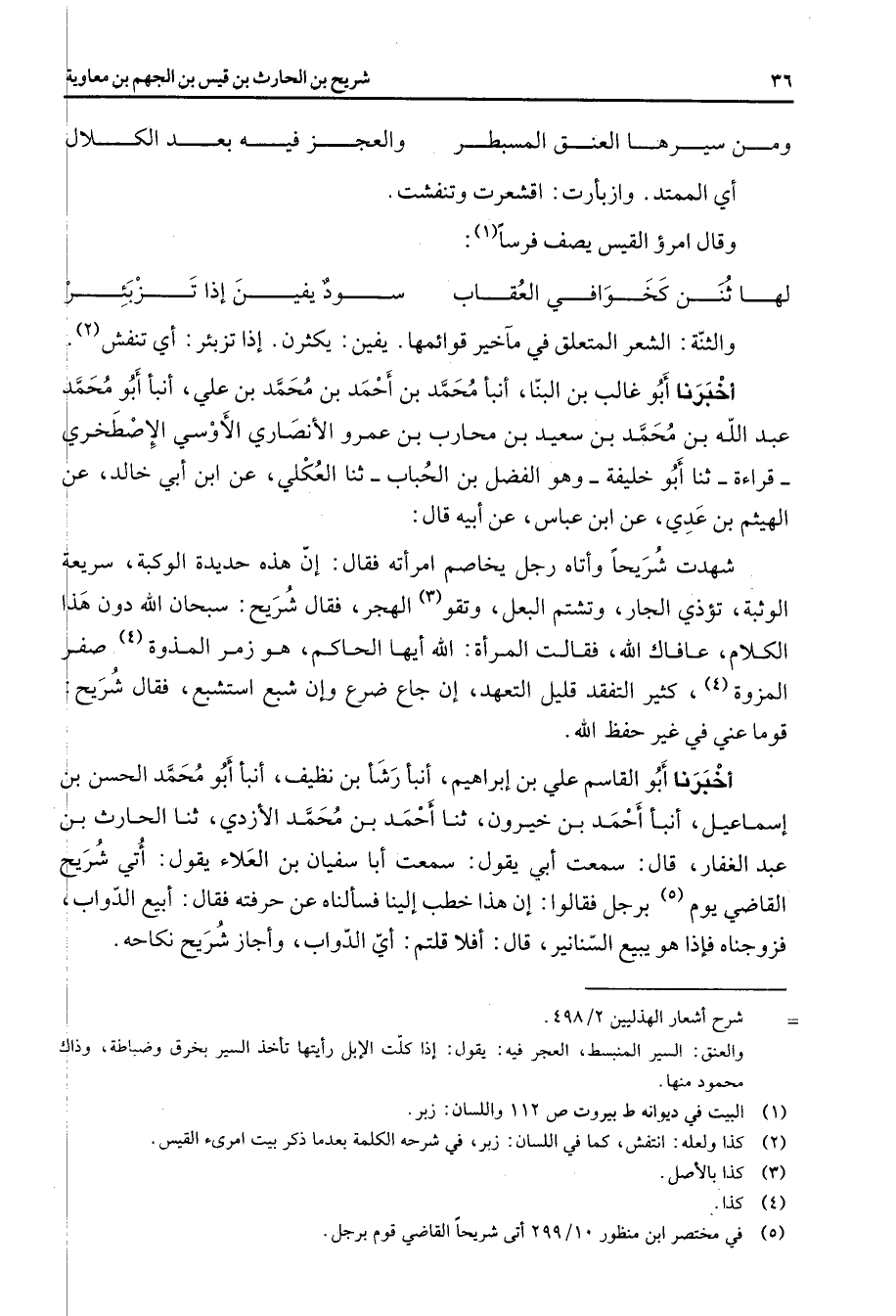 * ومن سيرها العنق المسبطر * والعجز فيه بعد الكلال * أي الممتد وازبأرت اقشعرت وتنفشت وقال امرؤ القيس يصف فرسا (1) * لها ثنن كخوافي العقاب * سود يفين إذا تزبئر * والثنة الشعر المتعلق في مآخير قوائمها يفين يكثرن إذا تزبئر أي تنفش (2) أخبرنا أبو غالب بن البنا أنبأ محمد بن أحمد بن محمد بن علي أنبأ أبو محمد عبد الله بن محمد بن سعيد بن محارب بن عمرو الأنصاري الأوسي الإصطخري قراءة ثنا أبو خليفة وهو الفضل بن الحباب ثنا العكلي عن ابن أبي خالد عن الهيثم بن عدي عن ابن عباس عنأبيه قال شهدت شريحا وأتاه رجل يخاصم امرأته فقال إن هذه حديدة الوكبة سريعة الوثبة تؤذي الجار وتشتم البعل وتقو الهجر فقال شريح سبحان الله دون هذا الكلام عافاك الله فقالت المرأة الله أيها الحاكم هو زمر المذوة صفر المزوة (4) كثير التفقد قليل التعهد إن جاع ضرع وإن شبع استشبع فقال شريح قوما عني في غير حفظ الله أخبرنا أبو القاسم علي بن إبراهيم أنبأ رشأ بن نظيف أنبأ أبو محمد الحسن بن إسماعيل أنبأ أحمد بن خيرون ثنا أحمد بن محمد الأزدي ثنا الحارث بن عبد الغفار قال سمعت أبي يقول سمعت أبا سفيان بن العلاء يقول أتي شريح القاضي يوم (5) برجل فقالوا إن هذا خطب إلينا فسألناه عن حرفته فقال أبيع الدواب فزوجناه فإذا هو يبيع السنانير قال أفلا قلتم أي الدواب وأجاز شريح نكاحه