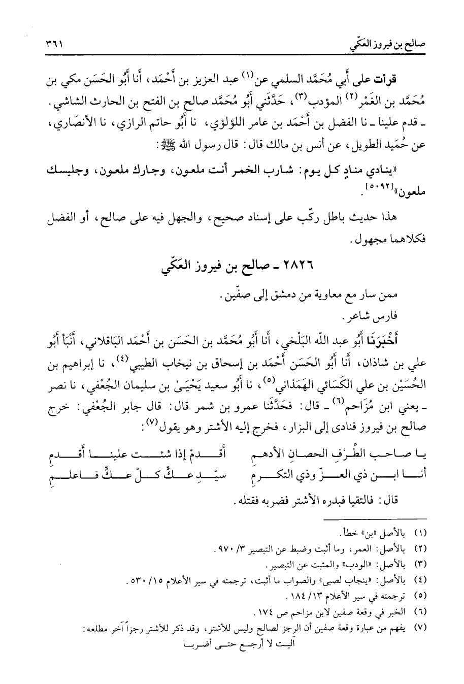 2826 - صالح بن فيروز العكي ممن سار مع معاوية من دمشق إلى صفين فارس شاعر أخبرنا أبو عبد الله البلخي أنا أبو محمد بن الحسن بن أحمد الباقلاني أنبأ أبو علي بن شاذان أنا أبو الحسن أحمد بن إسحاق بن نيخاب الطيبي (4) نا إبراهيم بن الحسين بن علي الكسائي الهمذاني (5) نا أبو سعيد يحيى بن سليمان الجعفي نا نصر يعني ابن مزاحم (6) قال فحدثنا عمرو بن شمر قال قال جابر الجعفي خرج صالح بن فيروز فنادى إلى البزار فخرج إليه الأشتر وهو يقول (7) * يا صاحب الطرف الحصان الأدهم * أقدم إذا شئت علينا أقدم أنا ابن ذي العز وذي التكرم * سيد عك كل عك فاعلم * قال فالتقيا فبدره الأشتر فضربه فقتله