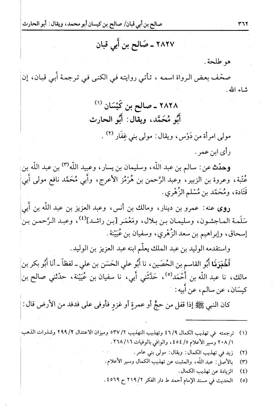 2828 - صالح بن كيسان (1) أبو محمد ويقال أبو الحارث مولى امرأة من دوس ويقال مولى بني غفار (2) رأى ابن عمر وحدث عن سالم بن عبد الله وسليمان بن يسار وعبيد الله (3) بن عبد الله بن عتبة وعروة بن الزبير وعبد الرحمن بن هرمز الأعرج وأبي محمد نافع مولى أبي قتادة ومحمد بن مسلم الزهري روى عنه عمرو بن دينار ومالك بن أنس وعبد العزيز بن عبد الله بن أبي سلمة الماجشون وسليمان بن بلال ومعمر بن راشد (4) وعبد الرحمن بن إسحاق وإبراهيم بن سعد الزهري وسفيان بن عيينة واستقدمه الوليد بن عبد الملك يعلم ابنه عبد العزيز بن الوليد أخبرنا أبو القاسم بن الحصين نا أبو علي الحسن بن علي لفظا أنا أبو بكر بن مالك نا عبد الله بن أحمد (5) حدثني أبي نا سفيان بن عيينة حدثني صالح بن كيسان عن سالم عن أبيه كان النبي (صلى الله عليه وسلم) إذا قفل من حج أو عمرة أو غزو فأوفى على فدفد من الأرض قال