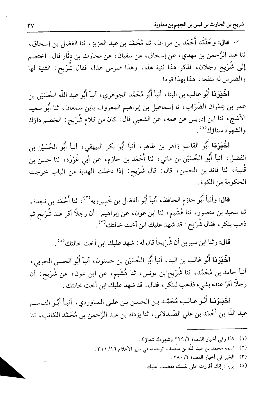 قال وحدثنا أحمد بن مروان ثنا محمد بن عبد العزيز ثنا الفضل بن إسحاق ثنا عبد الرحمن بن مهدي عن إسحاق عن سفيان عن محارث بن دثار قال اختصم إلى شريح رجلان فذكر هذا ثنية هذا وهذا ضرس هذا فقال شريح الثنية لها والضرس له منفعة هذا بهذا قوما أخبرنا أبو غالب بن البنا أنبأ أبو محمد الجوهري أنبأ أبو عبد الله الحسين بن عمر بن عمران الضراب نا إسماعيل بن إبراهيم المعروف بابن سمعان ثنا أبو سعيد الأشج ثنا ابن إدريس عن عمه عن الشعبي قال كان من كلام شريح الخصم داؤك والشهود سناؤك (1) أخبرنا أبو القاسم زاهر بن طاهر أنبأ أبو بكر البيهقي أنبأ أبو الحسين بن الفضل أنبأ أبو الحسين بن ماتي ثنا أحمد بن حازم عن أبي غرزة ثنا حسن بن قتيبة ثنا فاند بن الحسن قال قال شريح إذا دخلت الهدية من الباب خرجت الحكومة من الكوة قال وأنبأ أبو حازم الحافظ أنبأ أبو الفضل بن خميرويه (2) ثنا أحمد بن نجدة ثنا سعيد بن منصور ثنا هشيم ثنا ابن عون عن إبرهيم أن رجلا أقر عند شريح ثم ذهب ينكر فقال شريح قد شهد عليك ابن أخت خالتك قال وثنا ابن سيرين أن شريحا قال له شهد عليك ابن أخت خالتك (4) أخبرنا أبو غالب بن البنا أنبأ أبو الحسين بن حسنون أنبأ أبو الحسن الحربي أنبأ حامد بن محمد ثنا شريح بن يونس ثنا هشيم عن ابن عون عن شريح أن رجلا أقر عنده بشئ فذهب لينكر فقال قد شهد عليك ابن أخت خالتك أخبرنا أبو غالب محمد بن الحسن بن علي الماوردي أنبأ أبو القاسم عبد الله بن أحمد بن علي الصيدلاني ثنا يزداد بن عبد الرحمن بن محمد الكاتب ثنا