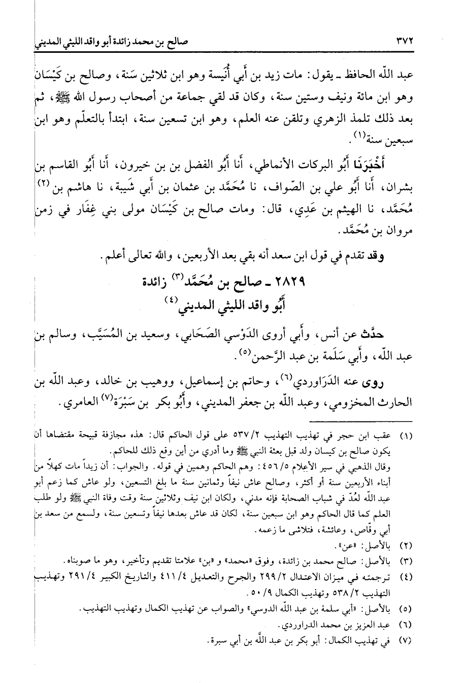 (1) عقب ابن حجر في تهذيب التهذيب 2 / 537 على قول الحاكم قال: هذه مجازفة قبيحة مقتضاها أن يكون صالح بن كيسان ولد قبل بعثة النبي صلى الله عليه وسلم وما أدرى من أين وقع ذلك للحاكم